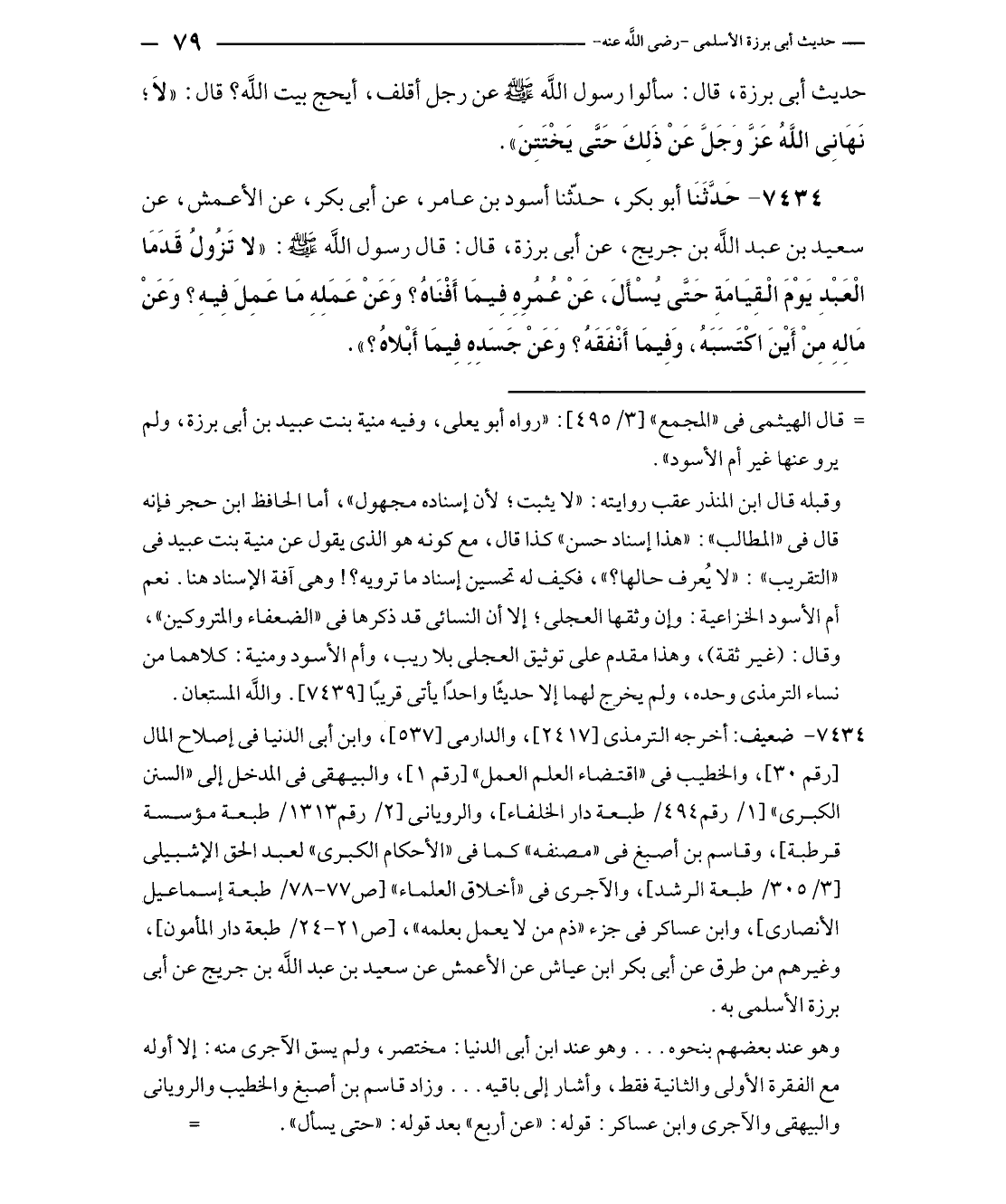 ٧٤٣٤ - حَدَّثَنَا أبو بكر، حدّثنا أسود بن عامر، عن أبي بكر، عن الأعمش، عن سعيد بن عبد الله بن جريج، عن أبي برزة، قال: قال رسول الله - صلى الله عليه وسلم -: "لا تَزولُ قَدَمَا العَبْدِ يَوْمَ الْقِيَامَةِ حَتَّى يُسْأَلَ، عَنْ عُمُرِهِ فِيمَا أَفْنَاهُ؟ وَعَنْ عَمَلِهِ مَا عَمِلَ فِيهِ؟ وَعَنْ مَالِهِ مِنْ أَيْنَ اكْتَسَبَه، وَفِيمَا أَنْفَقَهُ؟ وَعَنْ جَسَدِهِ فِيمَا أَبْلاهُ؟ ".