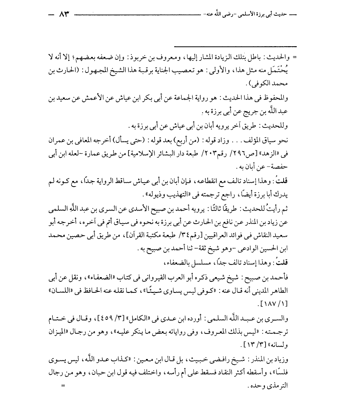 قلتُ: وهذا إسناد تالف مع انقطاعه، فإن أبان بن أبي عياش ساقط الرواية جدًّا، مع كونه لم يدرك أبا برزة أيضًا، راجع ترجمته في "التهذيب وذيوله".