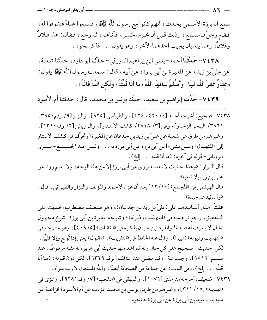 ٧٤٣٨ - صحيح: أخرجه أحمد [٤/ ٤٢٠، ٤٢٤]، والطيالسي [٩٢٥]، والبزار [٩/ رقم ٣٨٥٤، ٣٨٦١/ البحر الزخار]، وفي [٣/ ٢٨١٨/ كشف الأستار]، والروياني [٢/ رقم ١٣١٠]، وغيرهم من طرق عن شعبة عن عليّ بن زيد بن جدعان عن المغيرة [وتحرَّف في كشف الأستار إلى "المنهال" وليس بشيء] بن أبي برزة عن أبي برزة به ... وليس عند الجميع - سوى الروياني - قوله في آخره: (ما أنا قلته ... إلخ).