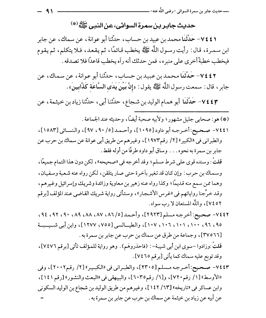 قلتُ: وسنده قوي على شرط مسلم؛ وقد أخرجه في "صحيحه"، لكن دون هذا التمام جميعًا، وسماك بن حرب: وإن كان قد تغير بآخرة حتى صار يتلقن، لكن رواه عنه شعبة وسفيان، وهما ممن سمع منه قديمًا؛ وكذا رواه عنه زهير بن معاوية وزائدة وشريك وإسرائيل وغيرهم، وقد خرَّجنا رواياتهم في "غرس الأشجار"، وستأتى رواية شريك القاضي عند المؤلف [برقم ٧٤٥٢]، واللَّه المستعان لا رب سواه.