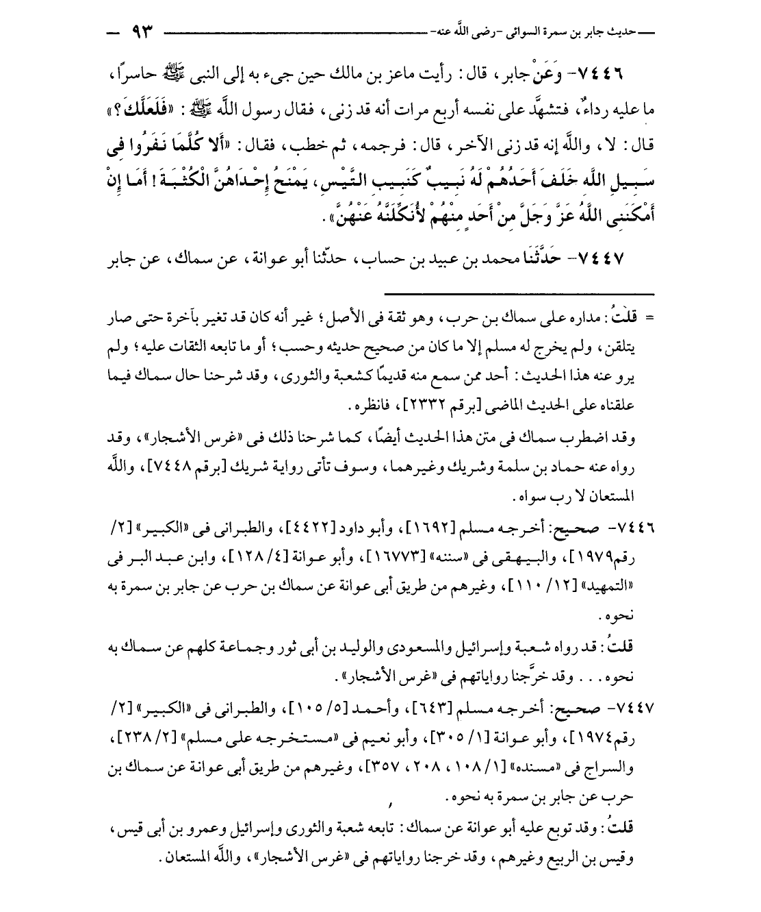 ٧٤٤٦ - وَعَنْ جابر، قال: رأيت ماعز بن مالك حين جئ به إلى النبي - صلى الله عليه وسلم - حاسرًا، ما عليه رداءٌ، فتشهَّد على نفسه أربع مرات أنه قد زنى، فقال رسول الله - صلى الله عليه وسلم -: "فَلَعَلَّكَ؟ " قال: لا، واللَّه إنه قد زنى الآخر، قال: فرجمه، ثم خطب، فقال: "أَلا كُلَّمَا نَفَرُوا فِي سَبِيلِ اللَّهِ خَلَفَ أَحَدُهُمْ لَهُ نَبِيبٌ كَنَبيبِ التَّيْسِ، يَمْنَحُ إِحدَاهُنَّ الْكُتْبَةَ! أَمَا إِنَّ أَمْكَنَنِى اللَّهُ عَزَّ وَجَلَّ مِنْ أَحَدٍ مِنْهُمْ لأُنَكِّلَنَّهُ عَنْهُنَّ".
