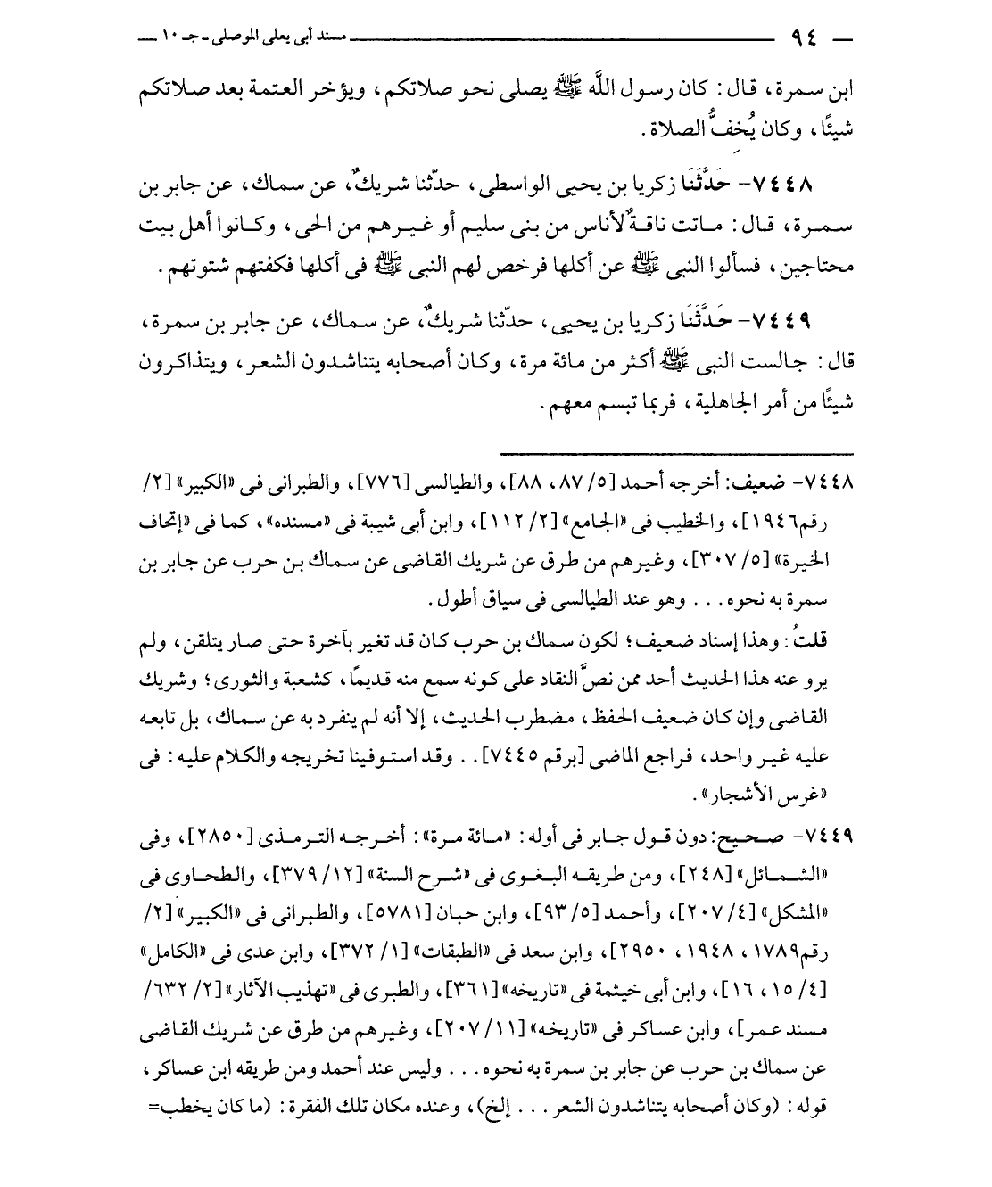 ٧٤٤٨ - ضعيف: أخرجه أحمد [٥/ ٨٧، ٨٨]، والطيالسي [٧٧٦]، والطبراني في "الكبير" [٢/ رقم ١٩٤٦]، والخطيب في "الجامع" [٢/ ١١٢]، وابن أبي شيبة في "مسنده"، كما في "إتحاف الخيرة" [٥/ ٣٠٧]، وغيرهم من طرق عن شريك القاضي عن سماك بن حرب عن جابر بن سمرة به نحوه ... وهو عند الطيالسي في سياق أطول.