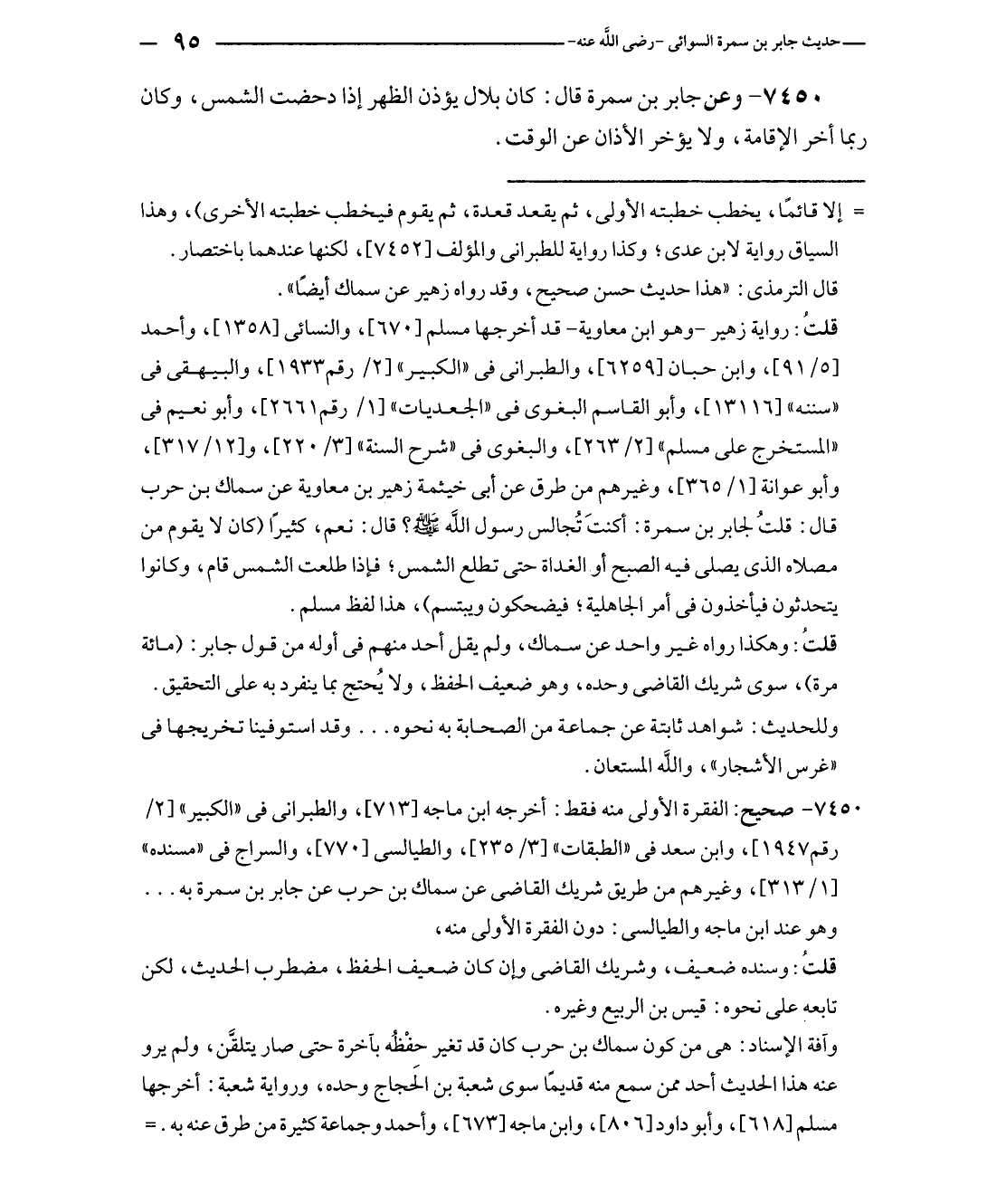 ٧٤٥٠ - صحيح: الفقرة الأولى منه فقط: أخرجه ابن ماجه [٧١٣]، والطبراني في "الكبير" [٢/ رقم ١٩٤٧]، وابن سعد في "الطبقات" [٣/ ٢٣٥]، والطيالسي [٧٧٠]، والسراج في "مسنده" [١/ ٣١٣]، وغيرهم من طريق شريك القاضي عن سماك بن حرب عن جابر بن سمرة به ... وهو عند ابن ماجه والطيالسي: دون الفقرة الأولى منه.