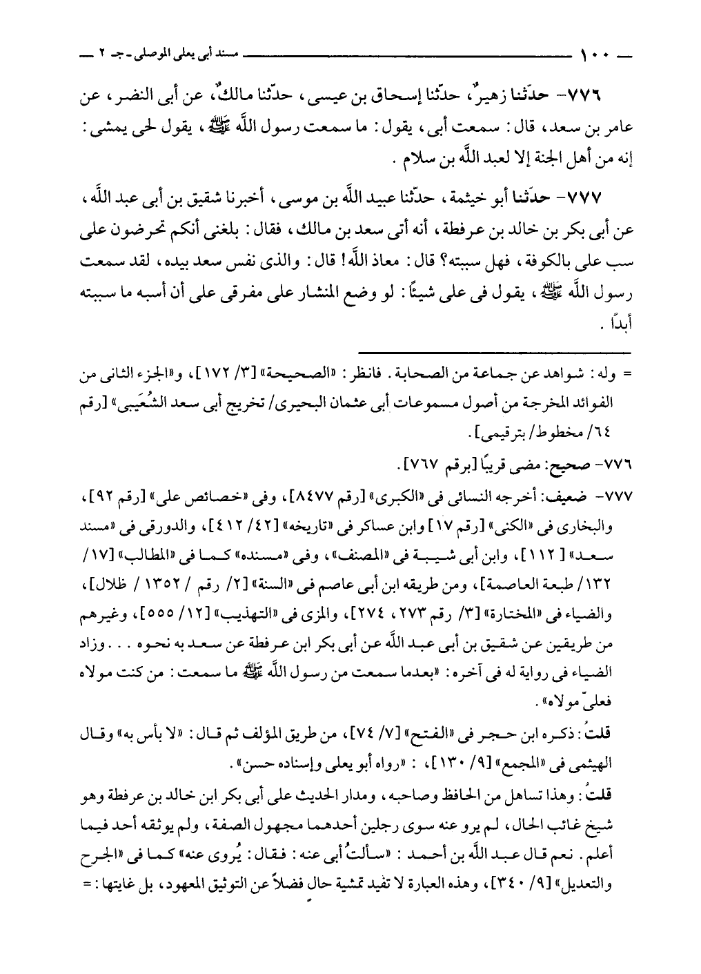 ٧٧٦ - حدّثنا زهير، حدّثنا إسحاق بن عيسى، حدّثنا مالك، عن أبى النضر، عن عامر بن سعد، قال: سمعت أبى، يقول: ما سمعت رسول الله - صلى الله عليه وسلم -، يقول لحى يمشى: إنه من أهل الجنة إلا لعبد الله بن سلام.