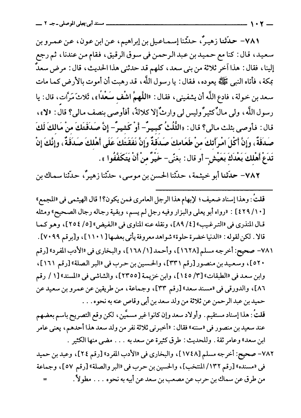 ٧٨١ - حدّثنا زهيرٌ، حدّثنا إسماعيل بن إبراهيم، عن ابن عون، عن عمرو بن سعيد، قال: كنا مع حميد بن عبد الرحمن في سوق الرقيق، فقام من عندنا، ثم رجع إلينا، فقال: هذا آخر ثلاثة من بنى سعد، كلهم قد حدثنى هذا الحديث، قال: مرض سعدٌ بمكة، فأتاه النبي - صلى الله عليه وسلم - يعوده، فقال: يا رسول الله، قد رهبت أن أموت بالأرض كما مات سعد بن خولة، فادع الله أن يشفينى، فقال: "اللَّهمَّ اشْفِ سَعْدًا"، ثَلاثَ مَراتٍ، قال: يا رسول الله، ولى مالٌ كثيرٌ وليس لى وارثٌ إلا كلالةً، أفأوصى بنصف مالى؟ قال: "لا"، قال: فأوصى بثلث مالٌ؟ قال: "الثُّلث كبِيرٌ - أَوْ كثِيرٌ - إِن صَدَقَتَكَ مِنْ مَالِكَ لَكَ صَدَقَةٌ، وَإِن أَكلَ امْرَأَتِكَ مِنْ طَعَامِكَ صَدَقِةٌ وَإِنَّ نَفَقَتَكَ عَلَى أَهْلِكَ صَدَقَةٌ، وإِنكَ إِنْ تَدَعْ أَهْلِكَ بَعْدَكَ بَعَيْش - أو قال: بغنًى - خَيْرٌ مِنْ أَنْ يَتَكَفَّفوا".