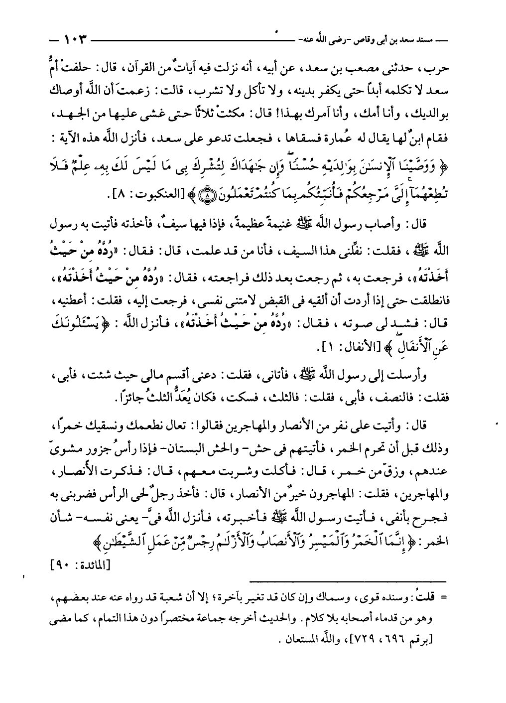 حرب، حدثنى مصعب بن سعد، عن أبيه، أنه نزلت فيه آياتٌ من القرآن، قال: حلفتْ أمُّ سعد لا تكلمه أبدًا حتى يكفر بدينه، ولا تأكل ولا تشرب، قالت: زعمتَ أن الله أوصاك بوالديك، وأنا أمك، وأنا آمرك بهذا! قال: مكثتْ ثلاثًا حتى غشى عليها من الجهد، فقام ابنٌ لها يقال له عُمارة فسقاها، فجعلت تدعو على سعد، فأنزل الله هذه الآية: {وَوَصَّيْنَا الْإِنْسَانَ بِوَالِدَيْهِ حُسْنًا وَإِنْ جَاهَدَاكَ لِتُشْرِكَ بِي مَا لَيْسَ لَكَ بِهِ عِلْمٌ فَلَا تُطِعْهُمَا إِلَيَّ مَرْجِعُكُمْ فَأُنَبِّئُكُمْ بِمَا كُنْتُمْ تَعْمَلُونَ (٨)} [العنكبوت: ٨].