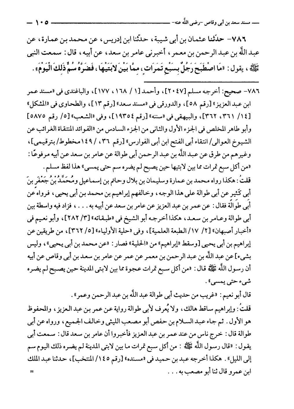 ٧٨٦ - صحيح: أخرجه مسلم [٢٠٤٧]، وأحمد [١/ ١٦٨، ١٧٧]، والباغندى في "مسند عمر بن عبد العزيز" [رقم ٥٨]، والدورقى في "مسند سعد" [رقم ١٣]، والطحاوى في "المشكل" [١٤/ ٣٦١، ٣٦٢]، والبيهقى في "سننه" [رقم ١٩٣٥٤]، وفى "الشعب" [٥/ رقم ٥٨٧٥] وأبو طاهر المخلص في الجزء الأول والثانى من الجزء السادس من "الفوائد المنتقاة الغرائب عن الشيوخ العوالى/ انتقاء أبى الفتح بن أبى الفوارس" [رقم ٣٦،/ ١٤٩ مخطوط/ بترقيمى]، وغيرهم من طرق عن عبد الله بن عبد الرحمن أبى طوالة عن عامر بن سعد عن أبيه مرفوعًا: "من أكل سبع تمرات مما بين لابتيها حين يصبح لم يضره سم حتى يمسى" هذا لفظ مسلم.