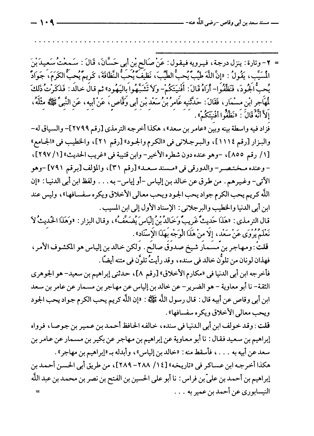 فَزاد فيه واسطة بينه وبين "عامر بن سعد"، هكذا أخرجه الترمذى [رقم ٢٧٩٩]- والسياق له - والبزار [رقم ١١١٤]، والبرجلانى في "الكرم والجود" [رقم ٢١]، والخطيب في "الجامع" [١/ رقم ٨٥٥]، - وهو عنده دون شطره الأخير - وابن قتيبة في "غريب الحديث" [١/ ٢٩٧]، - وعنده مختصر - والدورقى في "مسند سعد" [رقم ٣١]، والمؤلف [برقم ٧٩١]- وهو الآتى - وغيرهم. من طرق عن خالد بن إلياس - أو إياس - به ... ولفظ ابن أبى الدنيا: "إن الله كريم يحب الكرم جواد يحب الجود ويحب معالى الأخلاق ويكره سفسافها"، وليس عند ابن أبى الدنيا والخطيب والبرجلانى: الإسناد الأول إلى ابن المسيب.