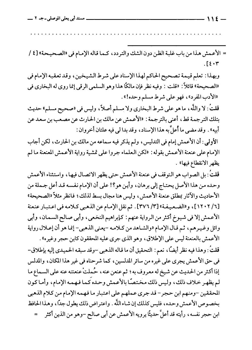 قلتُ: وهذا فيه نظر أيضًا، نعم: التحقيق أن ما قاله الذهبى - وقد سبقه الحميدى إليه بإطلاق - في حق الأعمش يجرى على غيره من سائر المدلسين، كما شرحناه في غير هذا المكان، والمدلس إذا أكثر من الحديث عن شيخ له معروف به؛ ثم عنعن عنه، حُملتْ عنعنته عنه على السماع ما لم يظهر خلاف ذلك، وليس ذلك مختصًا بالأعمش وحده كَما فهمه الإمام، وأما كون المحققين - ومنهم ابن حجر - قد جرى عملهم على اعتبار ما فهمه الإمام من كلام الذهبى بخصوص الأعمش وحده، فليس كذلك إن شاء الله. واعتراض ذلك يطول جدًّا، وهذا الحافظ ابن حجر نفسه، رأيته قد أعلَّ حديثًا يرويه الأعمش عن أبى صالح - وهو من الذين أكثر=