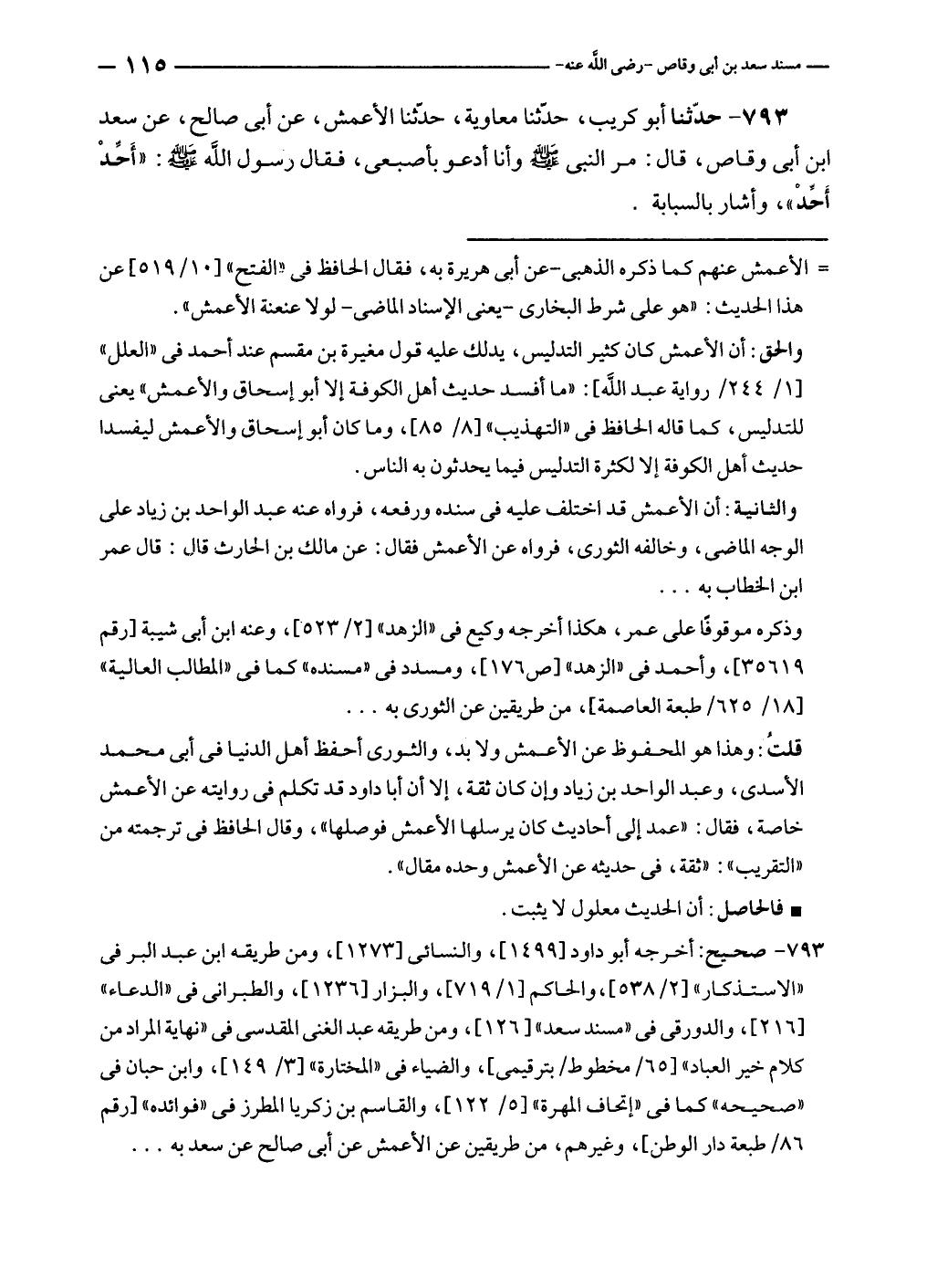٧٩٣ - حدّثنا أبو كريب، حدّثنا معاوية، حدّثنا الأعمش، عن أبى صالح، عن سعد بن أبى وقاص، قال: مر النبى -صلى الله عليه وسلم- وأنا أدعو بأصبعى، فقال رسول الله -صلى الله عليه وسلم-: "أَحِّدْ أَحِّدْ"، وأشار بالسبابة.