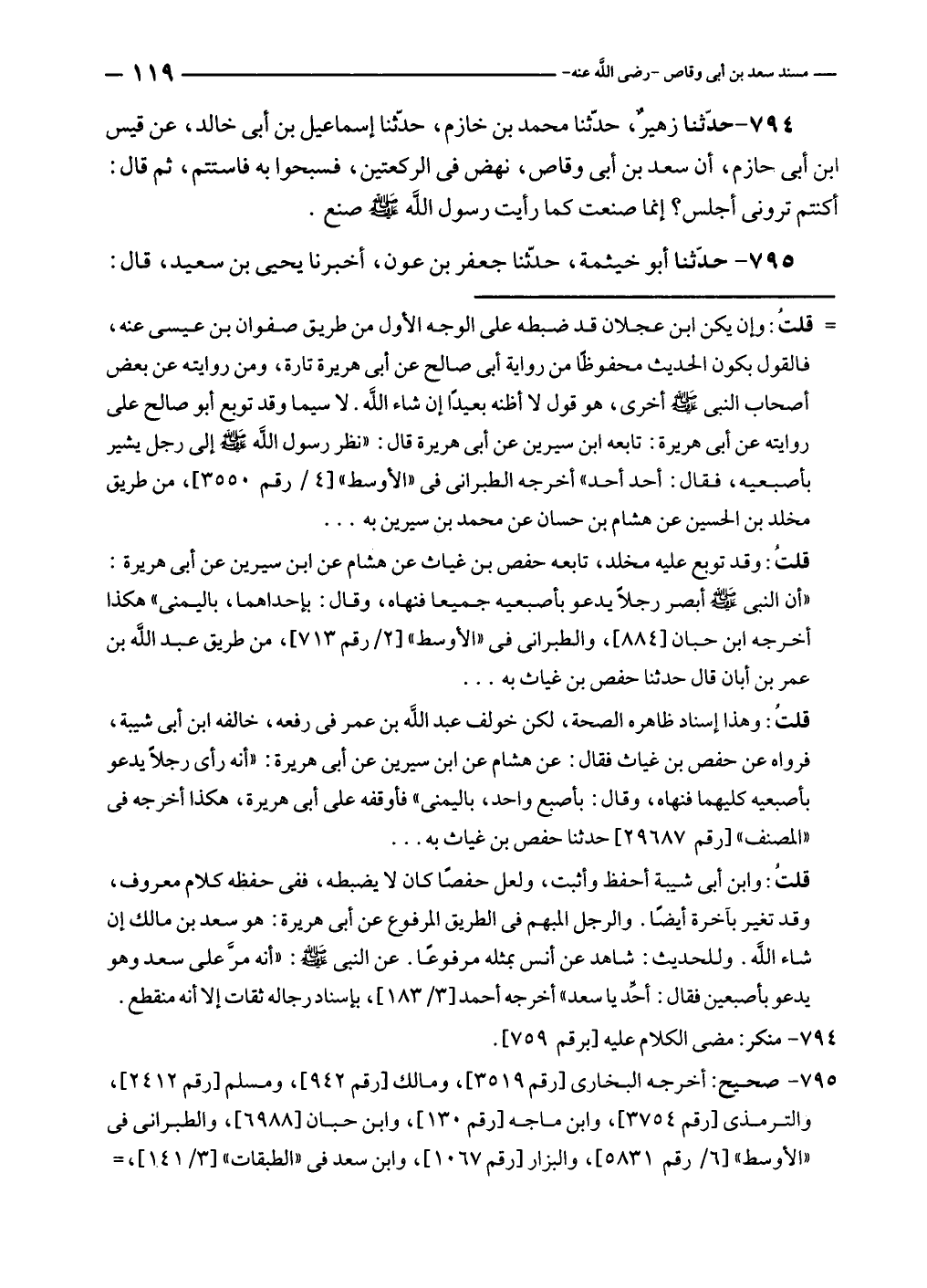 قلتُ: وابن أبى شيبة أحفظ وأثبت، ولعل حفصًا كان لا يضبطه، ففى حفظه كلام معروف، وقد تغير بآخرة أيضًا. والرجل المبهم في الطريق المرفوع عن أبى هريرة: هو سعد بن مالك إن شاء الله. وللحديث: شاهد عن أنس بمثله مرفوعًا. عن النبي - صلى الله عليه وسلم -: "أنه مرَّ على سعد وهو يدعو بأصبعين فقال: أحِّد يا سعد" أخرجه أحمد [٣/ ١٨٣]، بإسناد رجاله ثقات إلا أنه منقطع.