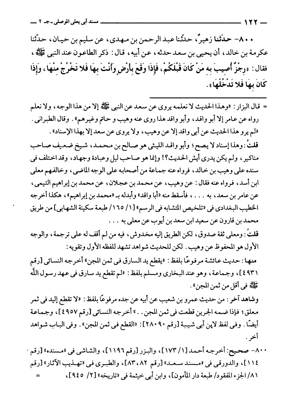 ٨٠٠ - حدّثنا زهير، حدثنا عبد الرحمن بن مهدى، عن سليم بن حيان، حدّثنا عكرمة بن خالد، أن يحيى بن سعد حدثه، عن أبيه، قال: ذكر الطاعون عند النبي - صلى الله عليه وسلم -، فقال: "رِجْزٌ أُصيبَ بِهِ مَنْ كَانَ قَبْلَكمْ، فَإذَا وَقَعَ بِأَرْضٍ وَأَنْتَ بِهَا فَلا تَخْرُجْ مِنْهَا، وَإذَا كَانَ بِهَا فَلا تَدْخُلْهَا".