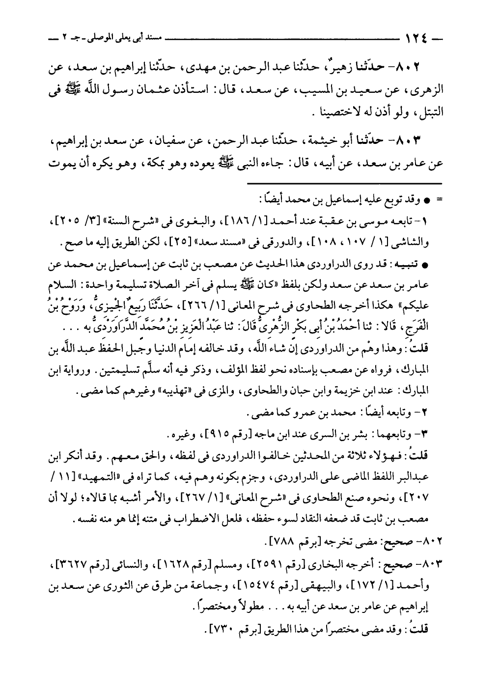 ١ - تابعه موسى بن عقبة عند أحمد [١/ ١٨٦]، والبغوى في "شرح السنة" [٣/ ٢٠٥]، والشاشى [١/ ١٠٧، ١٠٨]، والدورقى في"مسند سعد" [٢٥]، لكن الطريق إليه ما صح.