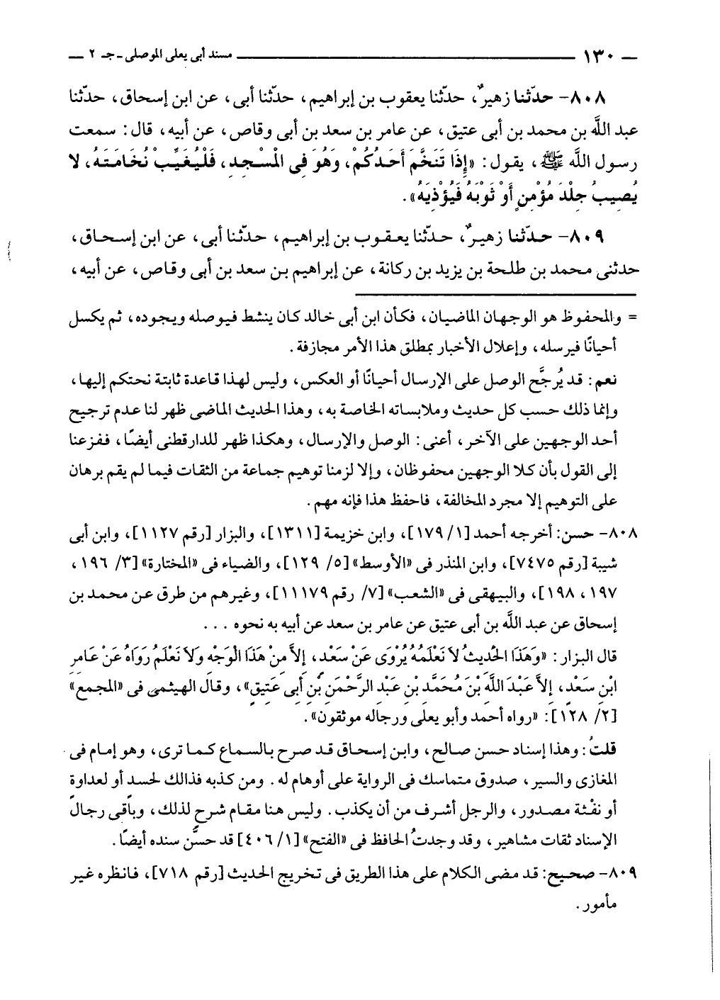 ٨٠٨ - حسن: أخرجه أحمد [١/ ١٧٩]، وابن خزيمة [١٣١١]،، والبزار [رقم ١١٢٧]، وابن أبى شيبة [رقم ٧٤٧٥]، وابن المنذر في "الأوسط" [٥/ ١٢٩]، والضياء في "المختارة" [٣/ ١٩٦] ١٩٧، ١٩٨]، والبيهقى في "الشعب" [٧/ رقم ١١١٧٩]، وغيرهم من طرق عن محمد بن إسحاق عن عبد الله بن أبى عتيق عن عامر بن سعد عن أبيه به نحوه ...