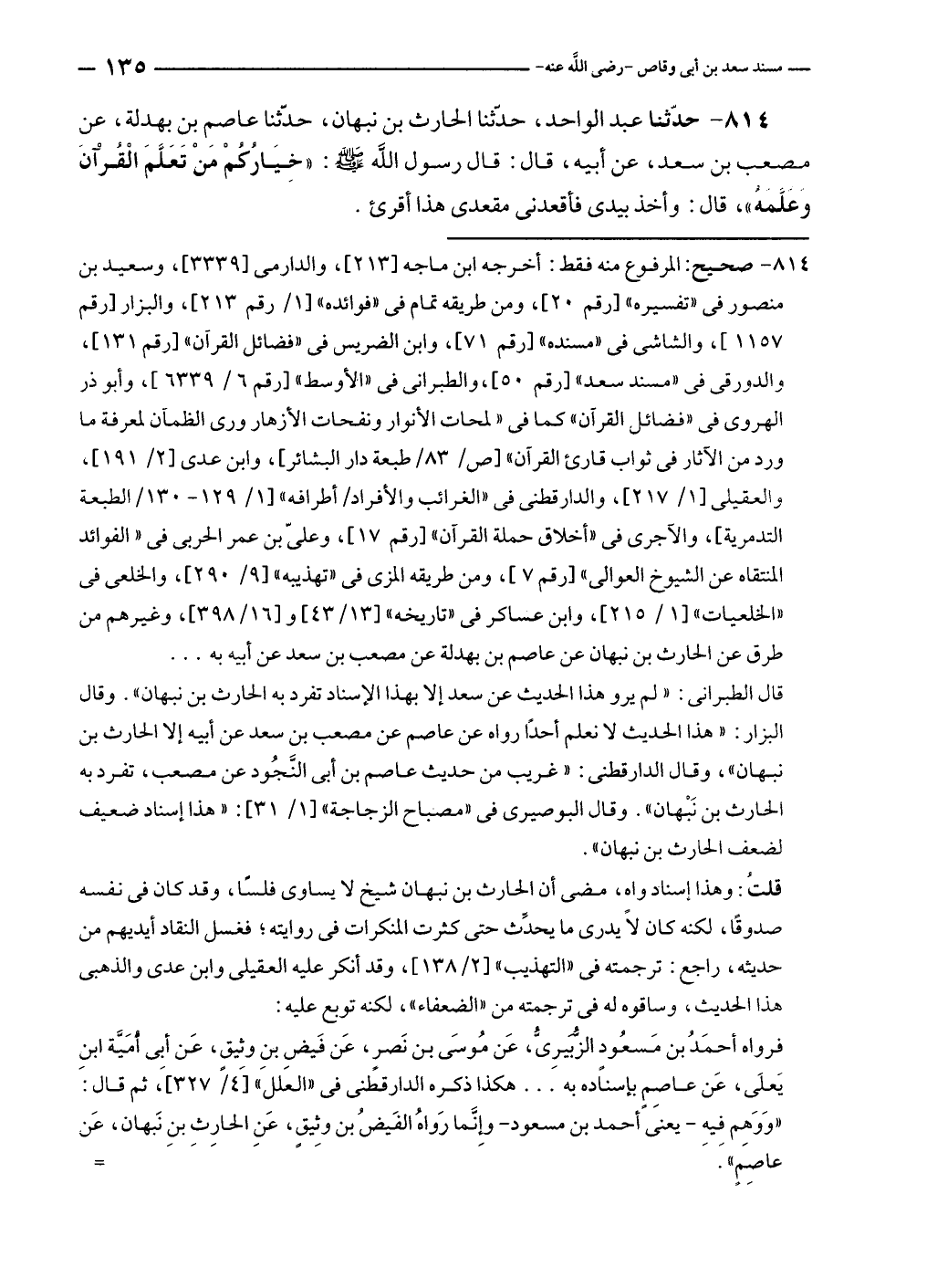 ٨١٤ - صحيح: المرفوع منه فقط: أخرجه ابن ماجه [٢١٣]، والدارمى [٣٣٣٩]، وسعيد بن منصور في "تفسيره" [رقم ٢٠]، ومن طريقه تمام في "فوائده" [١/ رقم ٢١٣]، والبزار [رقم ١١٥٧]، والشاشى في "مسنده" [رقم ٧١]، وابن الضريس في "فضائل القرآن" [رقم ١٣١]، والدورقى في "مسند سعد" [رقم ٥٠]، والطبرانى في "الأوسط" [رقم ٦/ ٦٣٣٩]، وأبو ذر الهروى في "فضائل القرآن" كما في "لمحات الأنوار ونفحات الأزهار ورى الظمآن لمعرفة ما ورد من الآثار في ثواب قارئ القرآن" [ص/ ٨٣/ طبعة دار البشائر]، وابن عدى [٢/ ١٩١]، والعقيلى [١/ ٢١٧]، والدارقطنى في "الغرائب والأفراد/ أطرافه" [١/ ١٢٩ - ١٣٠/ الطبعة التدمرية]، والآجرى في "أخلاق حملة القرآن" [رقم ١٧]، وعليّ بن عمر الحربى في "الفوائد المنتقاه عن الشيوخ العوالى" [رقم ٧]، ومن طريقه المزى في "تهذيبه" [٩/ ٢٩٠]، والخلعى في "الخلعيات" [١/ ٢١٥]، وابن عساكر في "تاريخه" [١٣/ ٤٣] و [١٦/ ٣٩٨]، وغيرهم من طرق عن الحارث بن نبهان عن عاصم بن بهدلة عن مصعب بن سعد عن أبيه به ...