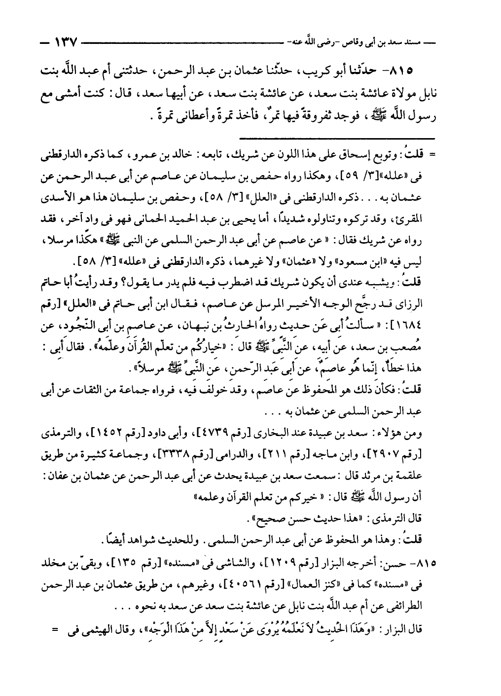 ٨١٥ - حسن: أخرجه البزار [رقم ١٢٠٩]، والشاشى في "مسنده" [رقم ١٣٥]، وبقى بن مخلد في "مسنده" كما في "كنز العمال" [رقم ٤٠٥٦١]، وغيرهم، من طريق عثمان بن عبد الرحمن الطرائفى عن أم عبد الله بنت نابل عن عائشة بنت سعد عن سعد به نحوه ...