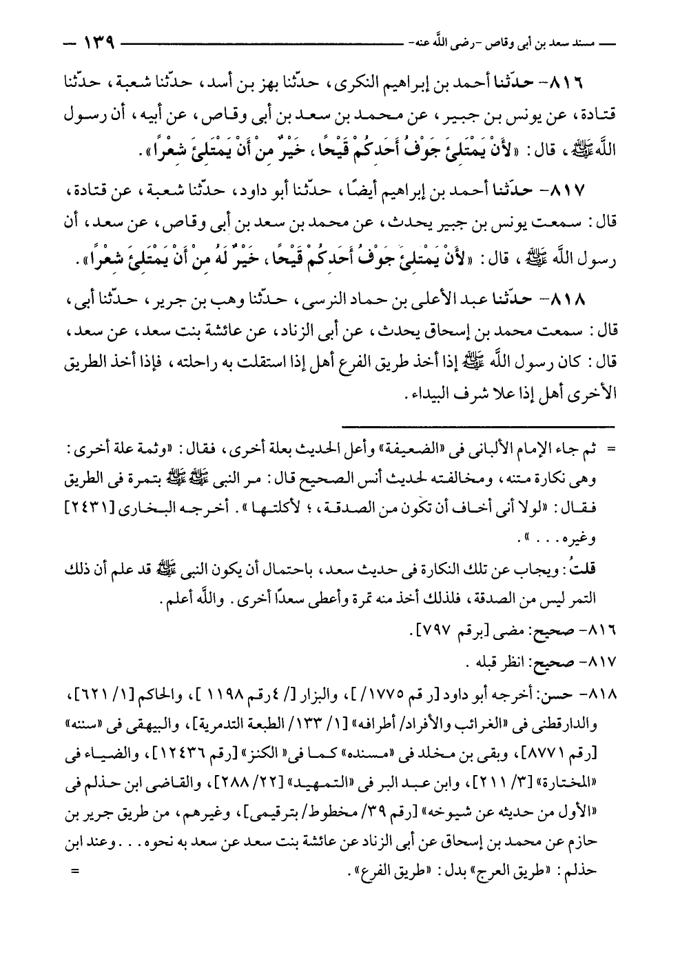 ٨١٨ - حسن: أخرجه أبو داود [رقم ١٧٧٥/]، والبزار [/ ٤ رقم ١١٩٨]، والحاكم [١/ ٦٢١]، والدارقطنى في "الغرائب والأفراد/ أطرافه" [١/ ١٣٣/ الطبعة التدمرية]، والبيهقى في "سننه" [رقم ٨٧٧١]، وبقى بن مخلد في "مسنده" كما في" الكنز" [رقم ١٢٤٣٦]، والضياء في "المختارة" [٣/ ٢١١]، وابن عبد البر في "التمهيد" [٢٢/ ٢٨٨]، والقاضى ابن حذلم في "الأول من حديثه عن شيوخه" [رقم ٣٩/ مخطوط/ بترقيمى]، وغيرهم، من طريق جرير بن حازم عن محمد بن إسحاق عن أبى الزناد عن عائشة بنت سعد عن سعد به نحوه ... وعند ابن حذلم: "طريق العرج" بدل: "طريق الفرع".=
