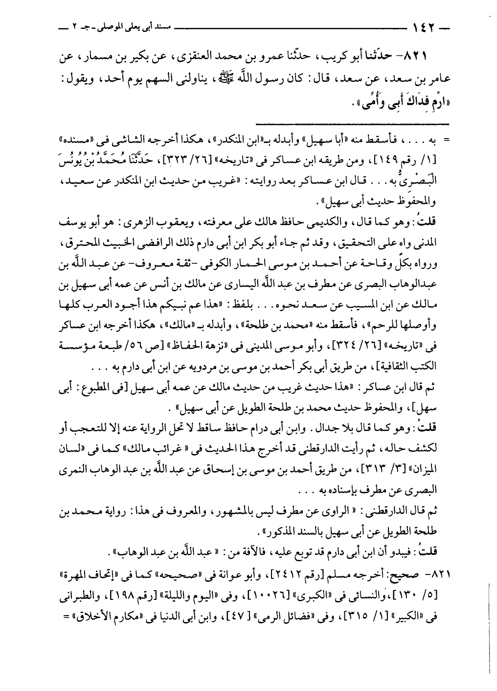 ٨٢١ - حدّثنا أبو كريب، حدّثنا عمرو بن محمد العنقزى، عن بكير بن مسمار، عن عامر بن سعد، عن سعد، قال: كان رسول الله - صلى الله عليه وسلم -، يناولنى السهم يوم أحد، ويقول: "ارْمِ فِدَاكَ أَبِي وَأُمِّى".