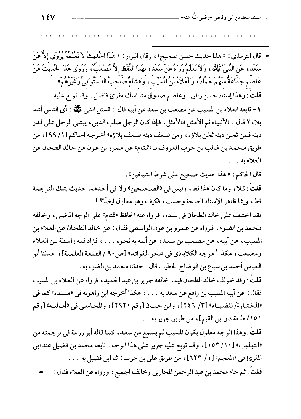 قلتُ: وقد خولف خالد الطحان فيه، خالفه جرير بن عبد الحميد، فرواه عن العلاء بن المسيب فقال: عن أبيه المسيب بن رافع عن سعد به ... ، هكذا أخرجه ابن راهويه في "مسنده" كما في "المختارة/ للضياء" [٣/ ٢٤٦]، وابن حبان [رقم ٢٩٢٠]، والمحاملى في "أماليه" [رقم ١٥١/ طبعة دار ابن القيم]، من طريق جرير به ...