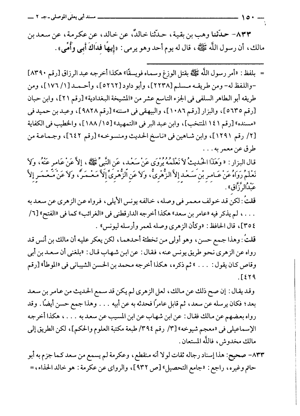 ٨٣٣ - حدّثنا وهب بن بقية، حدّثنا خالدٌ، عن خالد، عن عكرمة، عن سعد بن مالك، أن رسول الله - صلى الله عليه وسلم -، قال له يوم أحد وهو يرمى: "إِيها فِدَاكَ أَبِي وَأُمِّى".