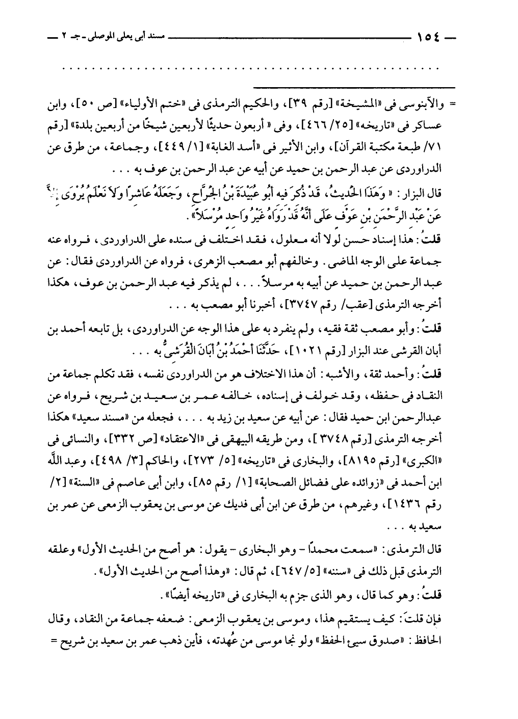 قلتُ: هَذا إسناد حسن لولا أنه معلول، فقد اخَتَلف في سنده على الدراوردى، فرواه عنه جماعة على الوجه الماضى. وخالفهم أبو مصعب الزهرى، فرواه عن الدراوردى فقال: عن عبد الرحمن بن حميد عن أبيه به مرسلًا ... ، لم يذكر فيه عبد الرحمن بن عوف، هكذا أخرجه الترمذى [عقب/ رقم ٣٧٤٧]، أخبرنا أبو مصعب به ...
