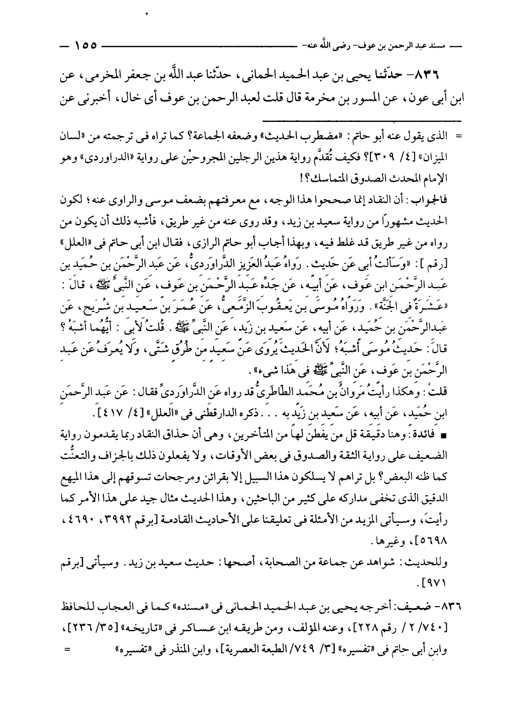 قلت: وَهكذا رأيتُ مَروانُ بن مُحَمَد الطّاطَريُّ قد رواه عَن الدَّراوَرديِّ فقال: عَن عَبد الرحمَنِ بنِ حُمَيد، عَن أبِيه، عَن سَعِيد بن زَيد به .. . ذكره الدارقطَنى في "العلل" [٤/ ٤١٧].