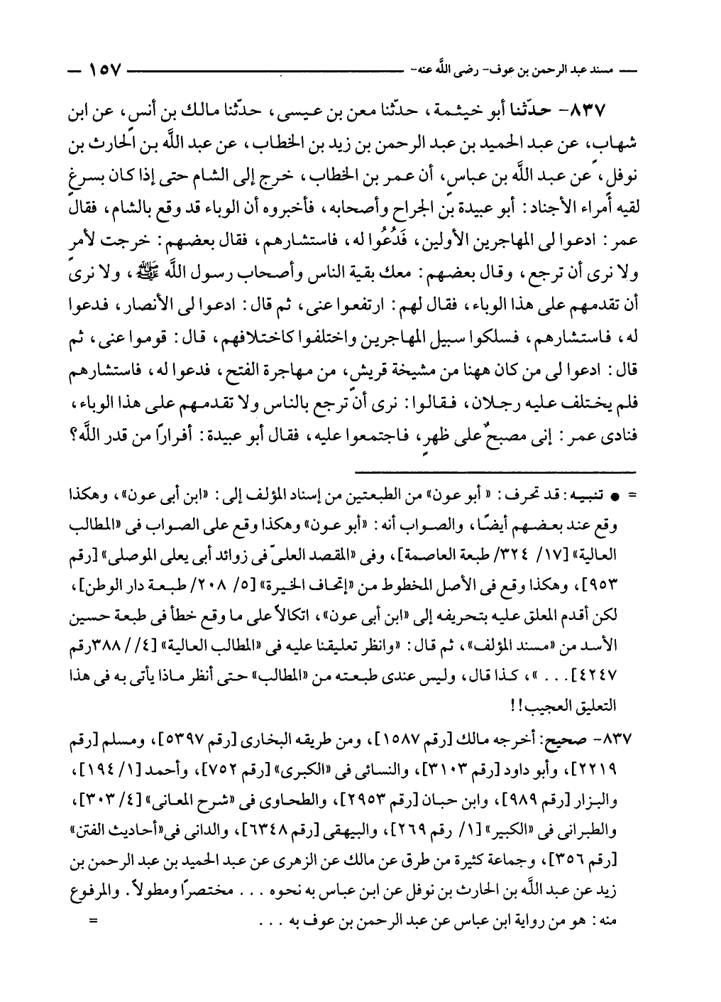 ٨٣٧ - حدّثنا أبو خيثمة، حدّثنا معن بن عيسى، حدّثنا مالك بن أنس، عن ابن شهاب، عن عبد الحميد بن عبد الرحمن بن زيد بن الخطاب، عن عبد الله بن الحارث بن نوفل، عن عبد الله بن عباس، أن عمر بن الخطاب، خرج إلى الشام حتى إذا كان بسرغٍ لقيه أمراء الأجناد: أبو عبيدة بن الجراح وأصحابه، فأخبروه أن الوباء قد وقع بالشام، فقال عمر: ادعوا لى المهاجرين الأولين، فَدُعُوا له، فاستشارهم، فقال بعضهم: خرجت لأمرٍ ولا نرى أن ترجع، وقال بعضهم: معك بقية الناس وأصحاب رسول الله - صلى الله عليه وسلم -، ولا نرى أن تقدمهم على هذا الوباء، فقال لهم: ارتفعوا عنى، ثم قال: ادعوا لى الأنصار، فدعوا له، فاستشارهم، فسلكوا سبيل المهاجرين واختلفوا كاختلافهم، قال: قوموا عنى، ثم قال: ادعوا لى من كان ههنا من مشيخة قريش، من مهاجرة الفتح، فدعوا له، فاستشارهم فلم يختلف عليه رجلان، فقالوا: نرى أن ترجع بالناس ولا تقدمهم على هذا الوباء، فنادى عمر: إنى مصبحٌ على ظهرٍ، فاجتمعوا عليه، فقال أبو عبيدة: أفرارًا من قدر الله؟