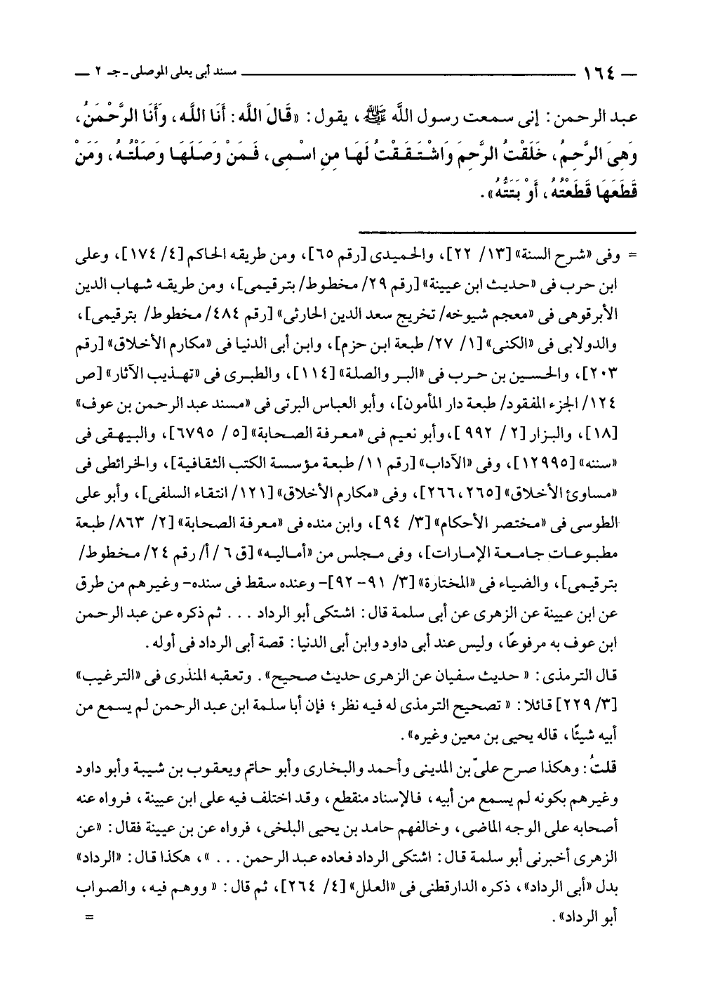 = وفى "شرح السنة" [١٣/ ٢٢]، والحميدى [رقم ٦٥]، ومن طريقه الحاكم [٤/ ١٧٤]، وعلى بن حرب في "حديث ابن عيينة" [رقم ٢٩/ مخطوط/ بترقيمى]، ومن طريقه شهاب الدين الأبرقوهى في "معجم شيوخه/ تخريج سعد الدين الحارثى" [رقم ٤٨٤/ مخطوط/ بترقيمى]، والدولابى في "الكنى" [١/ ٢٧/ طبعة ابن حزم]، وابن أبى الدنيا في "مكارم الأخلاق" [رقم ٢٠٣]، والحسين بن حرب في "البر والصلة" [١١٤]، والطبرى في "تهذيب الآثار" [ص ١٢٤/ الجزء المفقود/ طبعة دار المأمون]، وأبو العباس البرتى في "مسند عبد الرحمن بن عوف" [١٨]، والبزار [٢/ ٩٩٢]، وأبو نعيم في "معرفة الصحابة" [٥/ ٦٧٩٥]، والبيهقى في "سننه" [١٢٩٩٥]، وفى "الآداب" [رقم ١١/ طبعة مؤسسة الكتب الثقافية]، والخرائطى في "مساوئ الأخلاق" [٢٦٥، ٢٦٦]، وفى "مكارم الأخلاق" [١٢١/ انتقاء السلفى]، وأبو على الطوسى في "مختصر الأحكام" [٣/ ٩٤]، وابن منده في "معرفة الصحابة" [٢/ ٨٦٣/ طبعة مطبوعات جامعة الإمارات]، وفى مجلس من "أماليه" [ق ٦/ أ/ رقم ٢٤/ مخطوط/ بترقيمى]، والضياء في "المختارة" [٣/ ٩١ - ٩٢]- وعنده سقط في سنده - وغيرهم من طرق عن ابن عيينة عن الزهرى عن أبى سلمة قال: اشتكى أبو الرداد ... ثم ذكره عن عبد الرحمن بن عوف به مرفوعًا، وليس عند أبى داود وابن أبى الدنيا: قصة أبى الرداد في أوله.