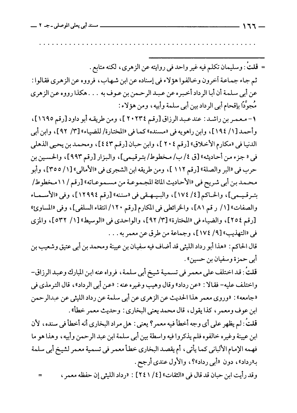 ثم جاء جماعة آخرون وخالفوا هؤلاء في إسناده عن ابن شهاب، فرووه عن الزهرى فقالوا: عن أبى سلمة أن أبا الرداد أخبره عن عبد الرحمن بن عوف به ... هكذا رووه عن الزهرى مُجوَّدًا بإقحام أبى الرداد بين أبى سلمة وأبيه، ومن هؤلاء: