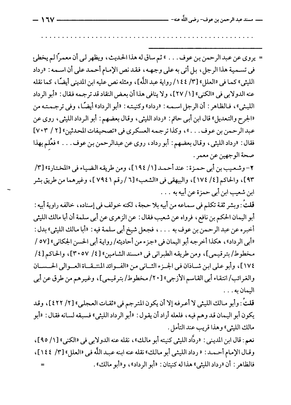 = يروى عن عبد الرحمن بن عوف ... " ثم ساق له هذا الحديث، ويظهر لى أن معمرًا لم يخطئ في تسمية هذا الرجل، بل أتى به على وجهه، فقد نص الإمام أحمد على أن اسمه: "رداد الليثى" كما في "العلل" [٣/ ١٤٤/ رواية عبد الله]، ومثله نص عليه ابن المدينى أيضًا، كما نقله عنه الدولابى في "الكنى" [١/ ٢٧]، ولا ينافى هذا أن بعض النقاد قد ترجمه فقال: "أبو الرداد الليثى"، فالظاهر: أن الرجل اسمه: "رداد" وكنيته: "أبو الرداد" أيضًا، وفى ترجمته من "الجرح والتعديل" قال ابن أبى حاتم: "رداد الليثى، وقال بعضهم: أبو الرداد الليثى، روى عن عبد الرحمن بن عوف ... "، وكذا ترجمه العسكرى في "تصحيفات المحدثين" [٢/ ٧٠٣] فقال: "رداد الليثى، وقال بعضهم: أبو رداد، روى عن عبد الرحمن بن عوف ... " فعُلِم بهذا صحة الوجهين عن معمر.