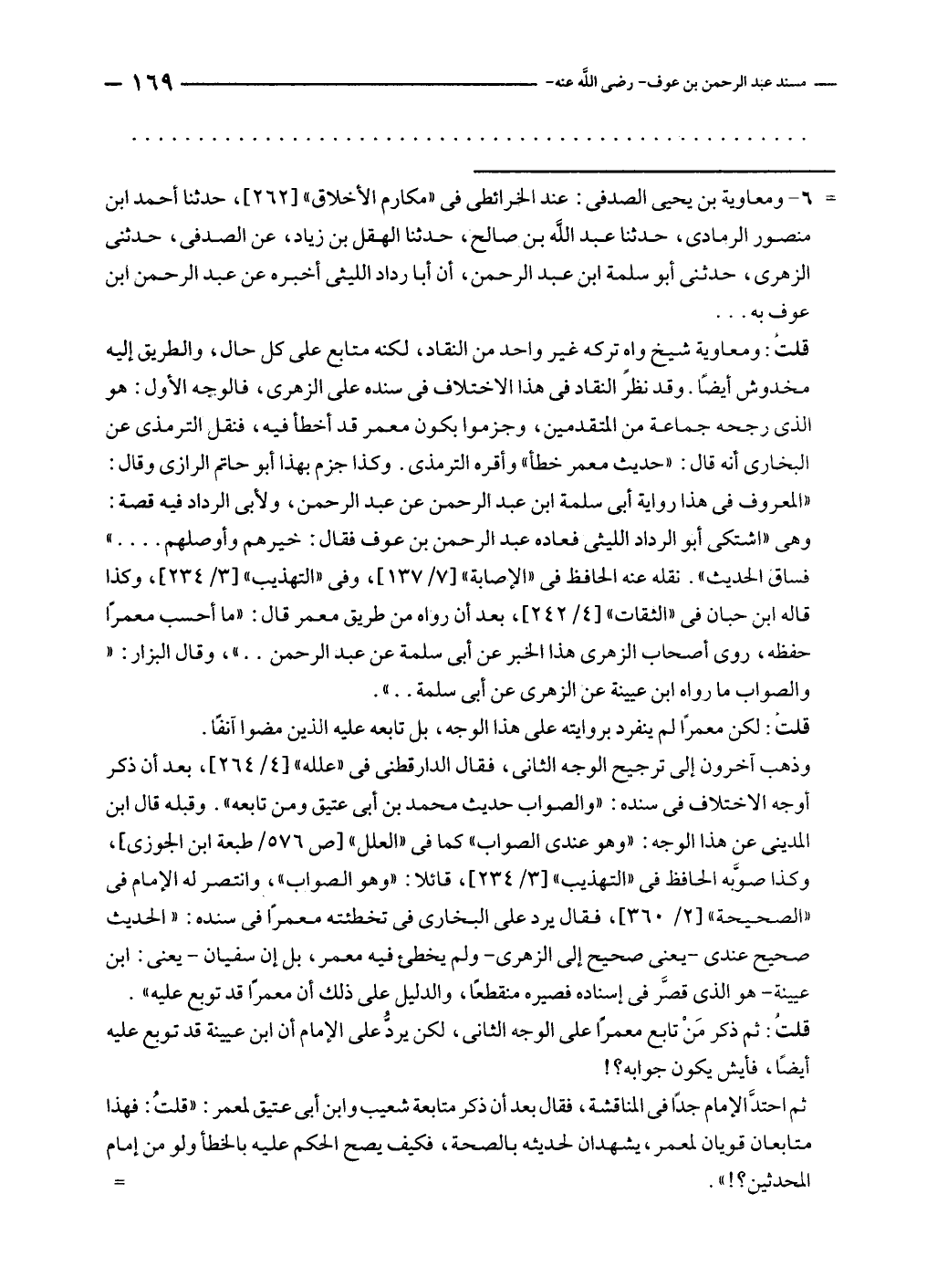 قلت: ومعاوية شيخ واه تركه غير واحد من النقاد، لكنه متابع على كل حال، والطريق إليه مخدوش أيضًا. وقد نظر النقاد في هذا الاختلاف في سنده على الزهرى، فالوجه الأول: هو الذي رجحه جماعة من المتقدمين، وجزموا بكون معمر قد أخطأ فيه، فنقل الترمذى عن البخارى أنه قال: "حديث معمر خطأ" وأقره الترمذى. وكذا جزم بهذا أبو حاتم الرازى وقال: "المعروف في هذا رواية أبى سلمة ابن عبد الرحمن عن عبد الرحمن، ولأبى الرداد فيه قصة: وهى "اشتكى أبو الرداد الليثى فعاده عبد الرحمن بن عوف فقال: خيرهم وأوصلهم .... " فساق الحديث". ناقله عنه الحافظ في "الإصابة" [٧/ ١٣٧]، وفى "التهذيب" [٣/ ٢٣٤]، وكذا قاله ابن حبان في "الثقات" [٤/ ٢٤٢]، بعد أن رواه من طريق معمر قال: "ما أحسب معمرًا حفظه، روى أصحاب الزهرى هذا الخبر عن أبى سلمة عن عبد الرحمن .. "، وقال البزار: "والصواب ما رواه ابن عيينة عن الزهرى عن أبى سلمة .. ".