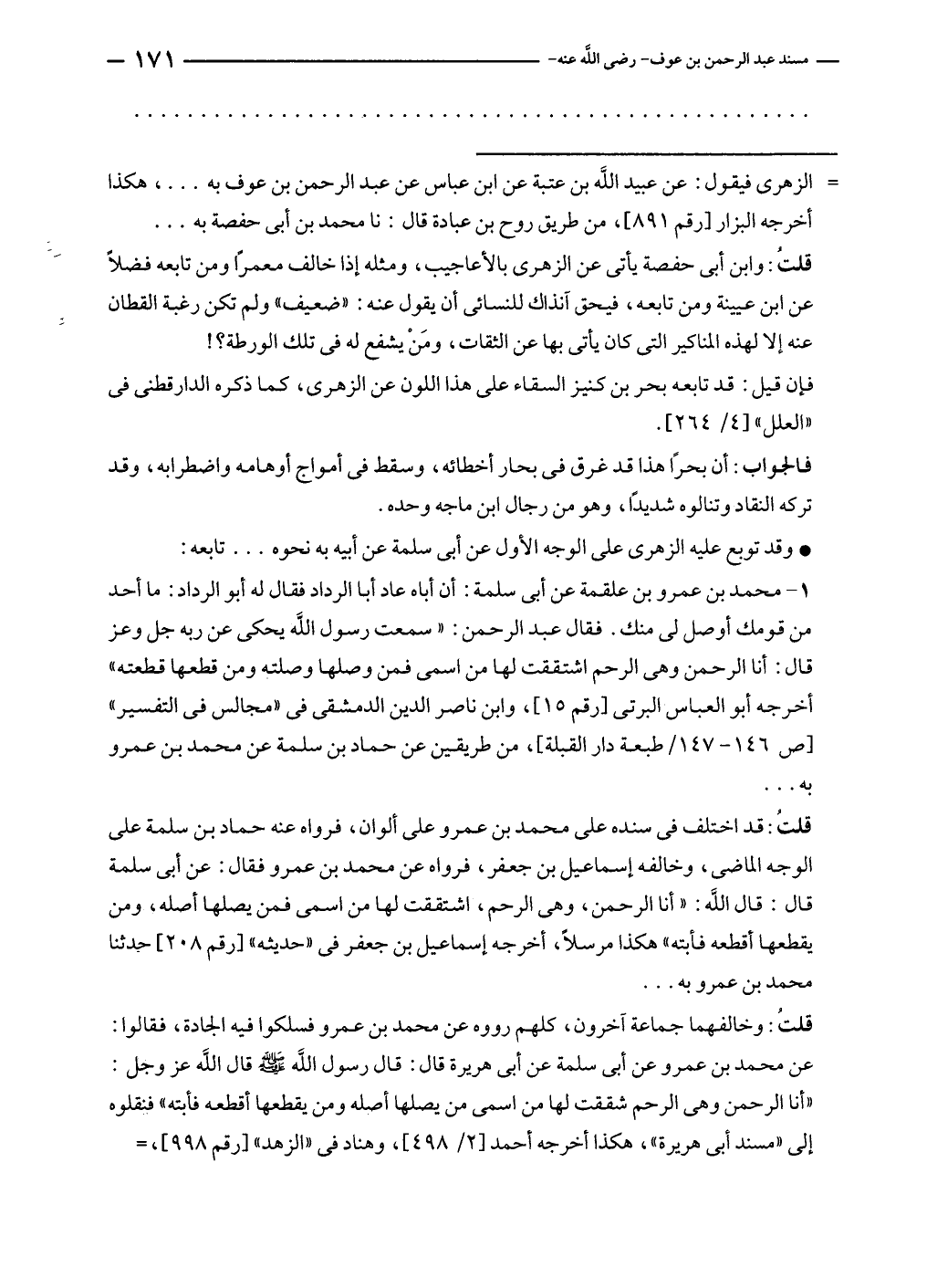 ١ - محمد بن عمرو بن علقمة عن أبى سلمة: أن أباه عاد أبا الرداد فقال له أبو الرداد: ما أحد من قومك أوصل لى منك. فقال عبد الرحمن: "سمعت رسول الله يحكى عن ربه جل وعز قال: أنا الرحمن وهى الرحم اشتققت لها من اسمى فمن وصلها وصلته ومن قطعها قطعته" أخرجه أبو العباس البرتى [رقم ١٥]، وابن ناصر الدين الدمشقى في "مجالس في التفسير" [ص ١٤٦ - ١٤٧/ طبعة دار القبلة]، من طريقين عن حماد بن سلمة عن محمد بن عمرو به.