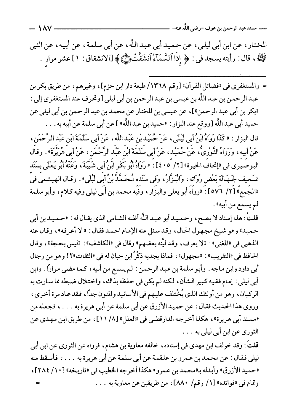 المختار، عن ابن أبى ليلى، عن حميد أبى عبد الله، عن أبى سلمة، عن أبيه، عن النبي - صلى الله عليه وسلم - قال: رأيته يسجد في: {إِذَا السَّمَاءُ انْشَقَّتْ (١)} [الانشقاق: ١] عشر مرارٍ.
