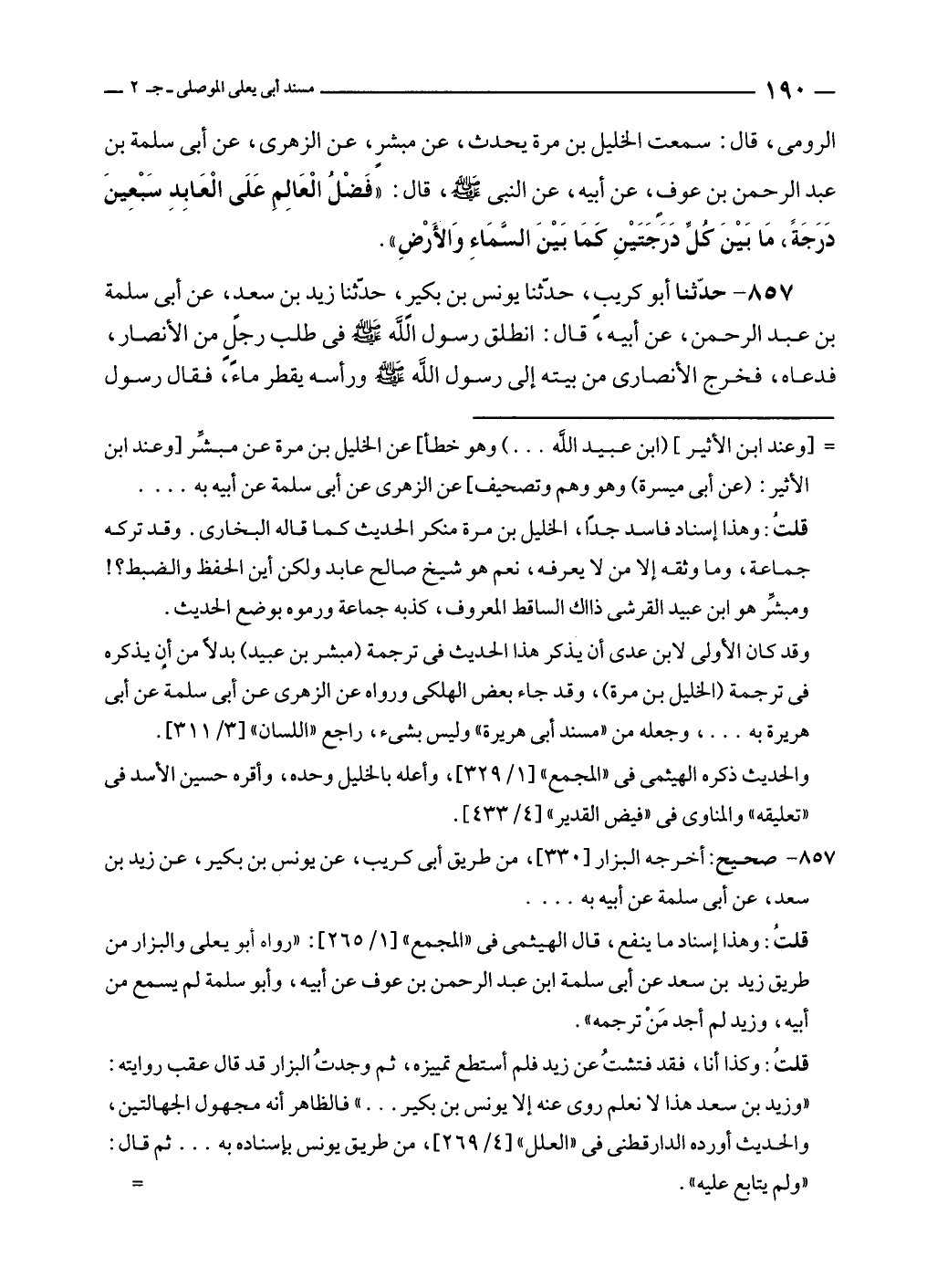 الرومي، قال: سمعت الخليل بن مرة يحدث، عن مبشرٍ، عن الزهرى، عن أبى سلمة بن عبد الرحمن بن عوف، عن أبيه، عن النبي - صلى الله عليه وسلم -، قال: "فَضْلُ الْعَالِمِ عَلَى الْعَابِدِ سَبْعِينَ دَرَجَةً، مَا بَيْنَ كُلِّ دَرَجَتَيْنِ كمَا بَيْنَ السَّمَاءِ وَالأَرْضِ".