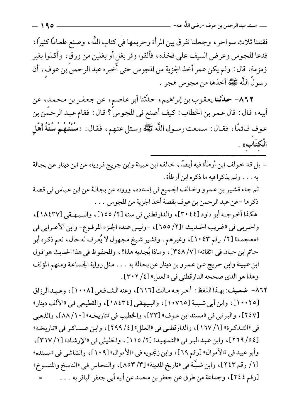 ٨٦٢ - حدّثنا يعقوب بن إبراهيم، حدّثنا أبو عاصمٍ، عن جعفر بن محمدٍ، عن أبيه، قال: قال عمر بن الخطاب: كيف أصنع في المجوس؟ قال: فقام عبد الرحمن بن عوفٍ قائمًا، فقال: سمعت رسول الله - صلى الله عليه وسلم - وسئل عنهم، فقال: "سُنَّتُهُمْ سُنَّةُ أَهْلِ الْكِتَابِ".