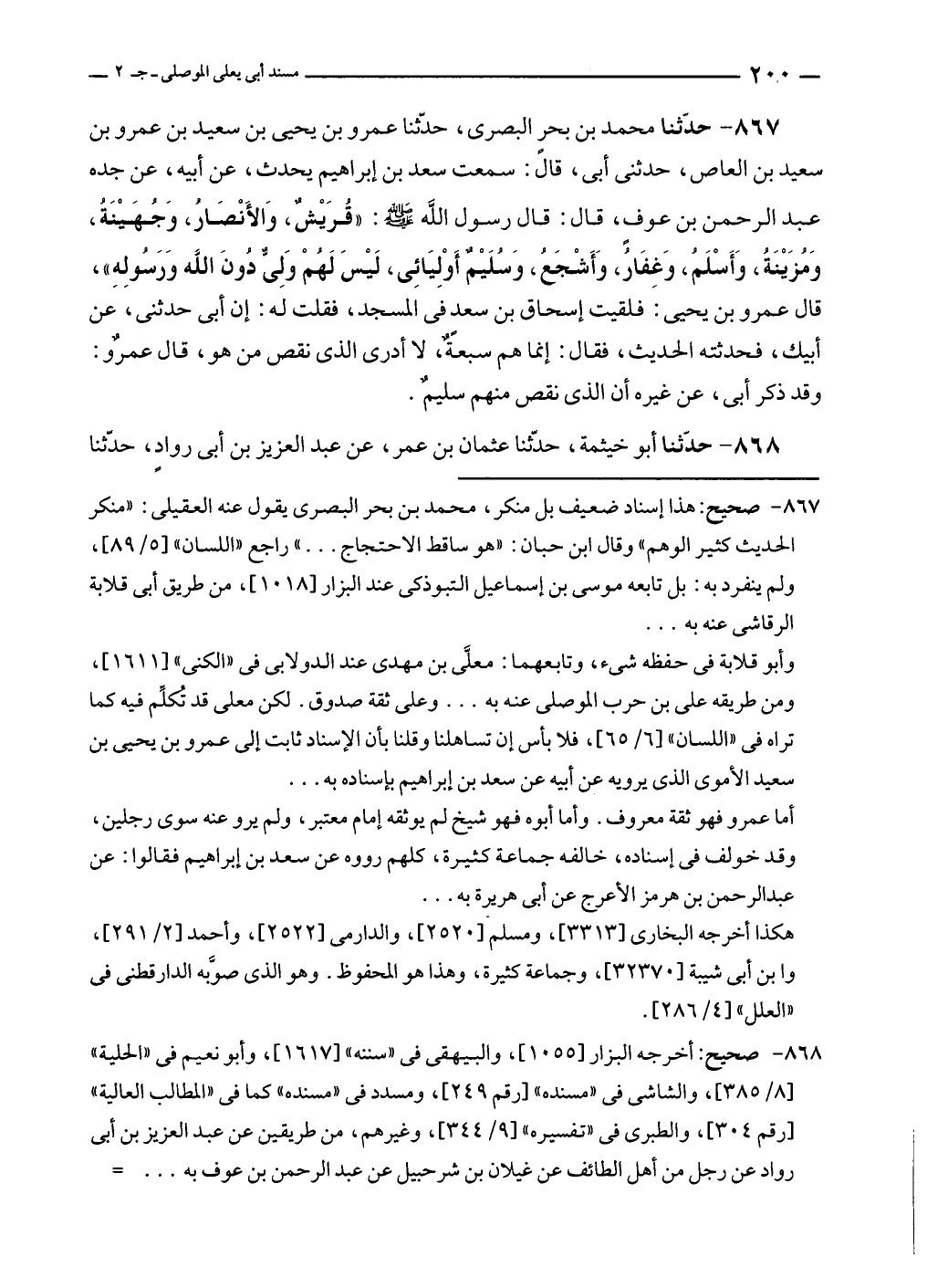 ٨٦٧ - حدّثنا محمد بن بحرٍ البصرى، حدّثنا عمرو بن يحيى بن سعيد بن عمرو بن سعيد بن العاص، حدثنى أبى، قال: سمعت سعد بن إبراهيم يحدث، عن أبيه، عن جده عبد الرحمن بن عوفٍ، قال: قال رسول الله - صلى الله عليه وسلم -: "قُرَيْشٌ، وَالأَنْصَارُ، وَجُهَيْنَةُ، وَمُزَيْنَةُ، وَأَسْلَمُ، وَغفَارُ، وَأَشْجَعُ، وَسُلَيْمٌ أَوْلِيَائِى، لَيْسَ لَهُمْ وَلِيٌّ دُونَ الله وَرَسُولِهِ"، قال عمرو بن يحيى: فلقيت إسحاق بن سعدٍ في المسجد، فقلت له: إن أبى حدثنى، عن أبيك، فحدثته الحديث، فقال: إنما هم سبعةٌ، لا أدرى الذي نقص من هو، قال عمرٌو: وقد ذكر أبى، عن غيره أن الذي نقص منهم سليمٌ.