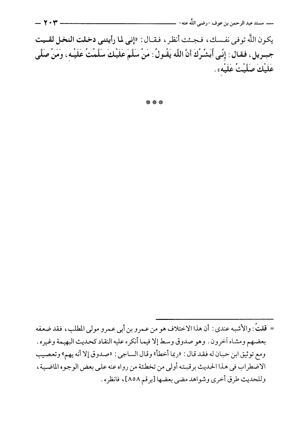 يكون الله توفى نفسك، فجئت أنظر، فقال: "إِنى لما رأيتنى دخلت النخل لقيت جبريل، فقال: إِنِّي أُبَشِّركَ أَنَّ الله يَقُولُ: مَنْ سَلَّمَ عَلَيْكَ سَلَّمْتُ عَلَيْهِ، وَمَنْ صَلَّى عَلَيْكَ صَلَّيْتُ عَلَيْهِ".