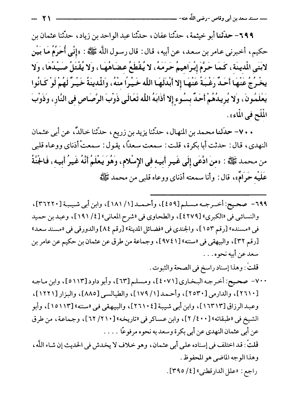٦٩٩ - صحيح: أخرجه مسلم [٤٥٩]، وأحمد [١/ ١٨١]، وابن أبى شيبة [٣٦٢٢٠]، والنسائى في "الكبرى" [٤٢٧٩]، والطحاوى في شرح المعانى" [٤/ ١٩١]، وعبد بن حميد في "مسنده" [رقم ١٥٣]، والجندى في "فضائل المدينة" [رقم ٨٤] والدورقى في "مسند سعد" [رقم ٣٢]، والبيهقى في "سننه" [٩٧٤١]، وجماعة من طرق عن عثمان بن حكيم عن عامر بن سعد عن أبيه نحوه. . .