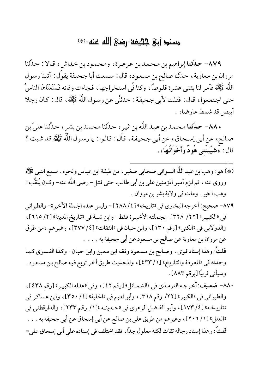 ٨٨٠ - حدّثنا محمد بن عبد الله بن نميرٍ، حدّثنا محمد بن بشرٍ، حدّثنا عليّ بن صالحٍ، عن أبى إسحاق، عن أبى جحيفة، قال: قالوا: يا رسول الله - صلى الله عليه وسلم - قد شبت؟ قال: "شَيَّبتْنِى هُودٌ وَأَخَوَاتُهَا".