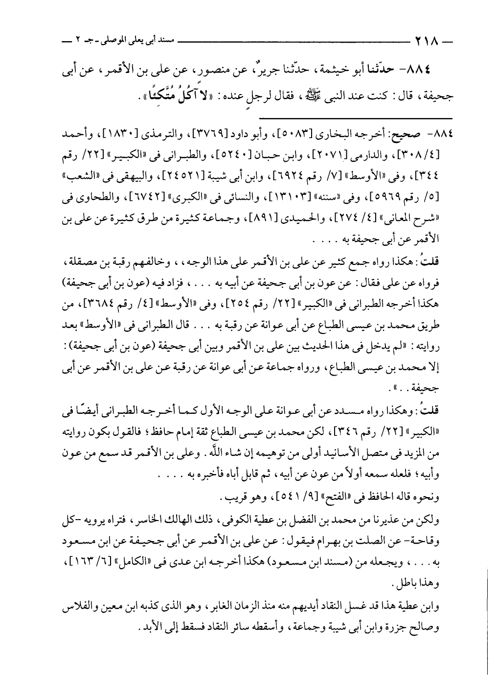 ٨٨٤ - حدّثنا أبو خيثمة، حدّثنا جريرٌ، عن منصورٍ، عن علي بن الأقمر، عن أبى جحيفة، قال: كنت ضد النبي - صلى الله عليه وسلم -، فقال لرجلٍ عنده: "لا آكُلُ مُتَّكِئًا".