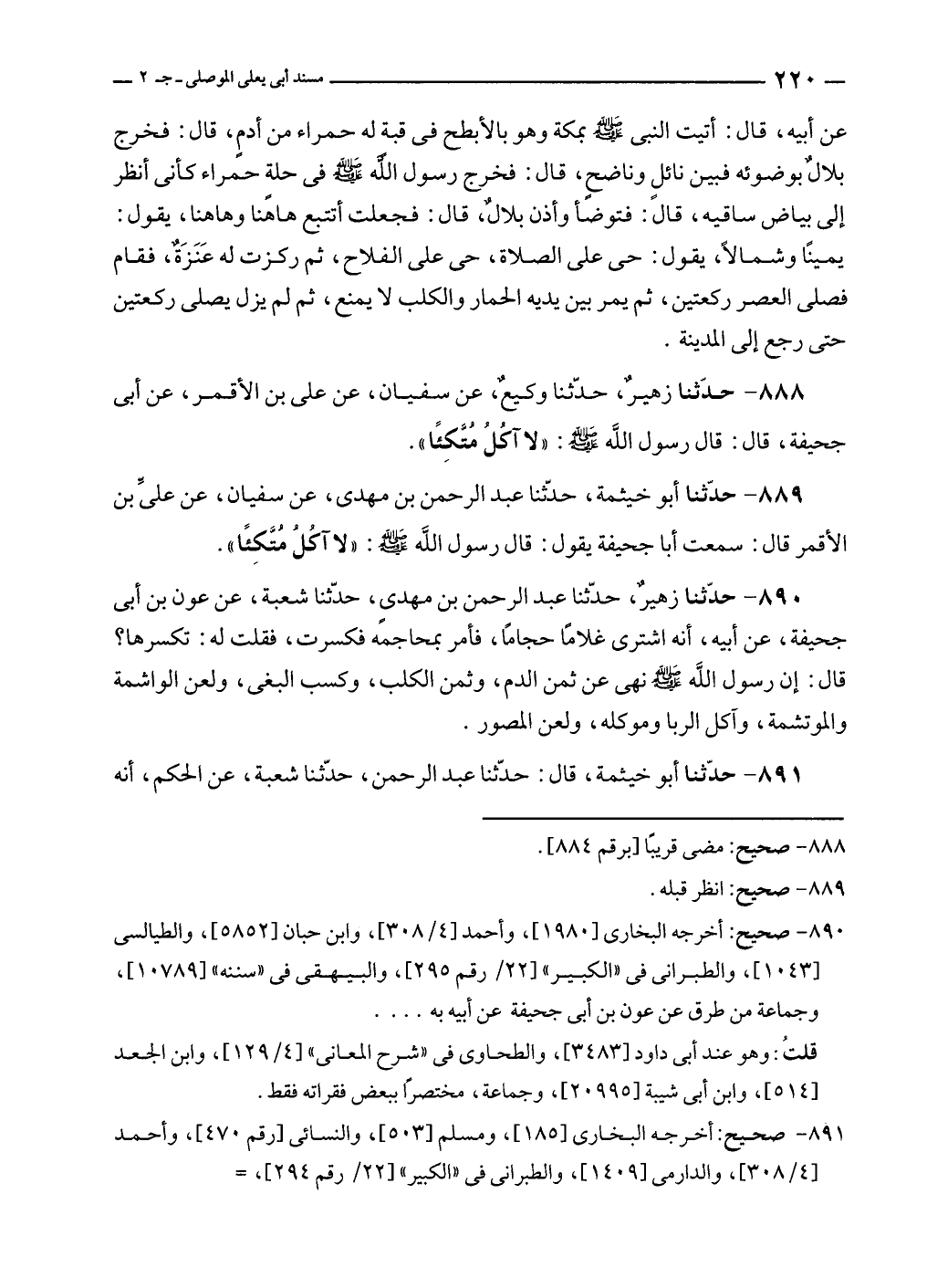 ٨٨٨ - حدثنا زهيرٌ، حدّثنا وكيعٌ، عن سفيان، عن علي بن الأقمر، عن أبى جحيفة، قال: قال رسول الله - صلى الله عليه وسلم -: "لا آكُلُ مُتَّكِئًا".