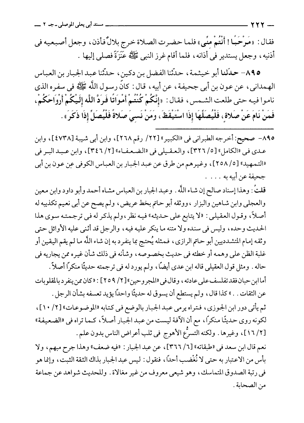 ٨٩٥ - حدّثنا أبو خيثمة، حدّثنا الفضل بن دكينٍ، حدّثنا عبد الجبار بن العباس الهمدانى، عن عون بن أبى جحيفة، عن أبيه، قال: كان رسول الله - صلى الله عليه وسلم - في سفره الذي ناموا فيه حتى طلعت الشمس، فقال: "إِنَّكمْ كُنْتمْ أَمْوَاتًا فَرَدَّ الله إلَيْكُمْ أَرْوَاحَكُمْ، فَمَنْ نَامَ عَنْ صَلاةٍ، فَلْيُصَلِّهَا إِذَا اسْتَيْقَظَ، وَمَنْ نَسِيَ صَلاةً فَلْيُصَلِّ إِذَا ذَكَرَ".