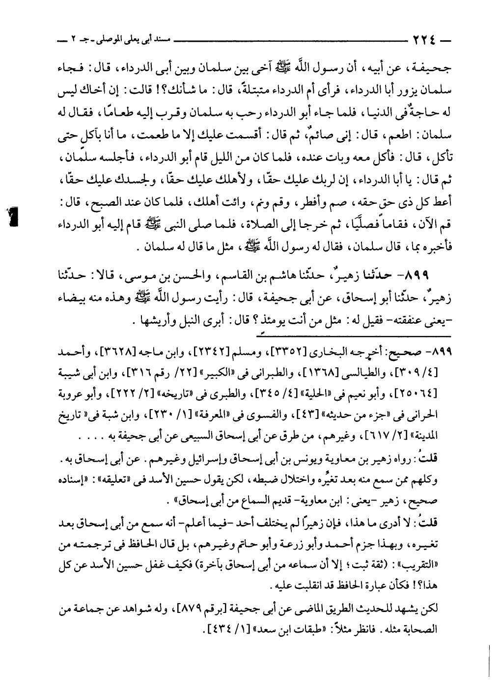 وكلهم ممن سمع منه بعد تغيِّره واختلال ضبطه، لكن يقول حسين الأسد في "تعليقه": "إسناده صحيح، زهير - يعنى: ابن معاوية - قديم السماع من أبى إسحاق".