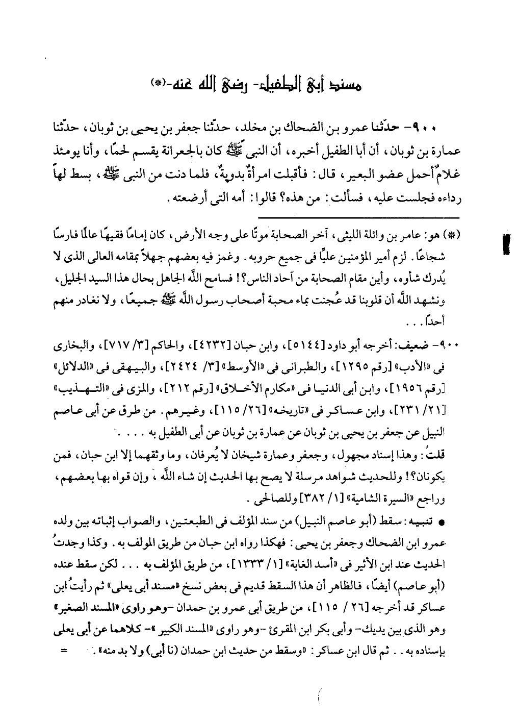 ٩٠٠ - ضعيف: أخرجه أبو داود [٥١٤٤]، وابن حبان [٤٢٣٢]، والحاكم [٣/ ٧١٧]، والبخارى في "الأدب" [رقم ١٢٩٥]، والطبرانى في "الأوسط" [٣/ ٢٤٢٤]، والبيهقى في "الدلائل" [رقم ١٩٥٦]، وابن أبى الدنيا في "مكارم الأخلاق" [رقم ٢١٢]، والمزى في "التهذيب" [٢١/ ٢٣١]، وابن عساكر في "تاريخه" [٢٦/ ١١٥]، وغيرهم. من طرق عن أبى عاصم النبيل عن جعفر بن يحيى بن ثوبان عن عمارة بن ثوبان عن أبى الطفيل به ....