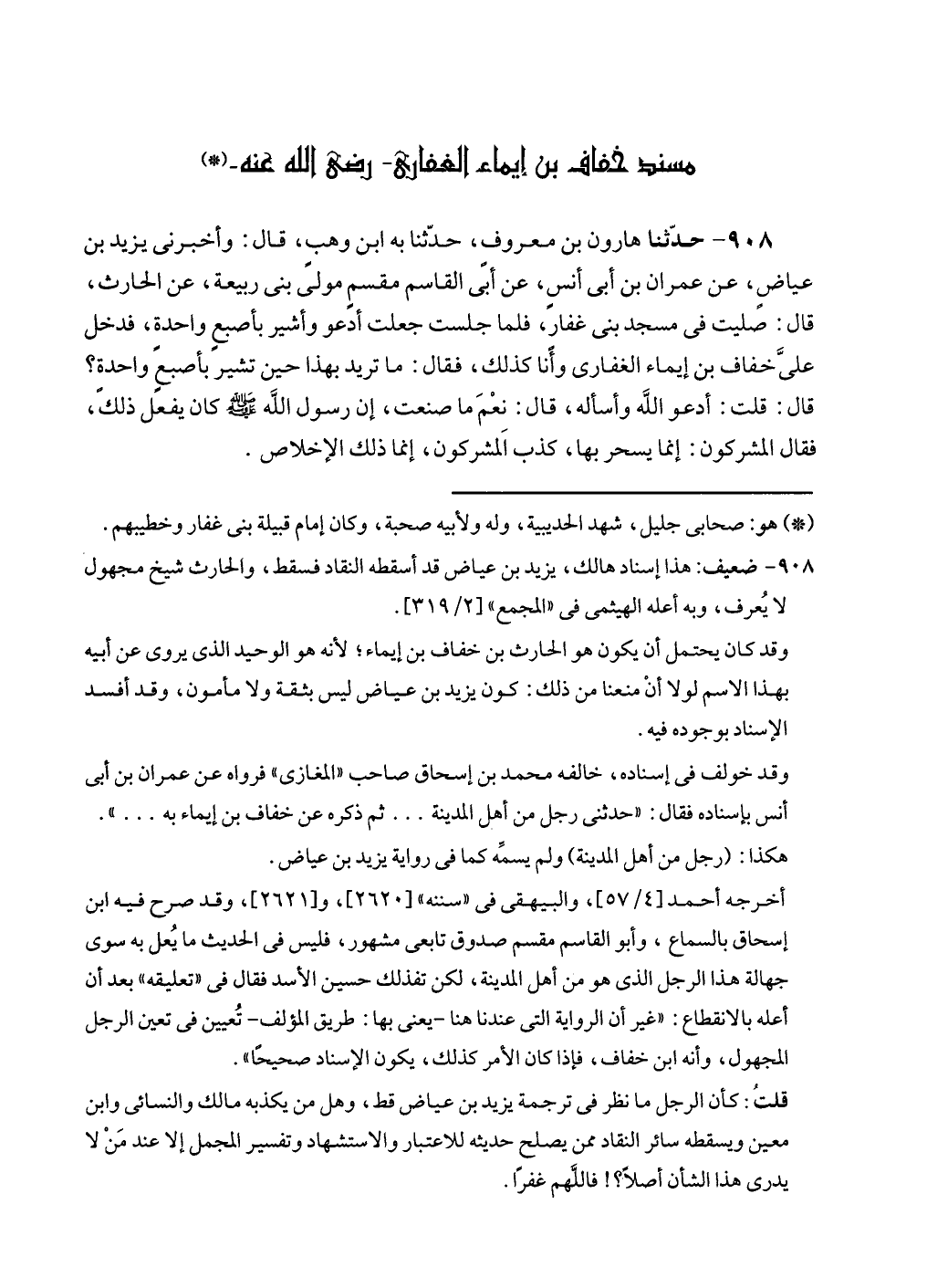 ٩٠٨ - حدّثنا هارون بن معروف، حدّثنا به ابن وهبٍ، قال: وأخبرنى يزيد بن عياضٍ، عن عمران بن أبى أنسٍ، عن أبى القاسم مقسمٍ مولى بنى ربيعة، عن الحارث، قال: صليت في مسجد بنى غفارٍ، فلما جلست جعلت أدعو وأشير بأصبعٍ واحدةٍ، فدخل عليَّ خفاف بن إيماء الغفارى وأنا كذلك، فقال: ما تريد بهذا حين تشير بأصبعٍ واحدةٍ؟ قال: قلت: أدعو الله وأسأله، قال: نِعْمَ ما صنعت، إن رسول الله - صلى الله عليه وسلم - كان يفعل ذلك، فقال المشركون: إنما يسحر بها، كذب المشركون، إنما ذلك الإخلاص.