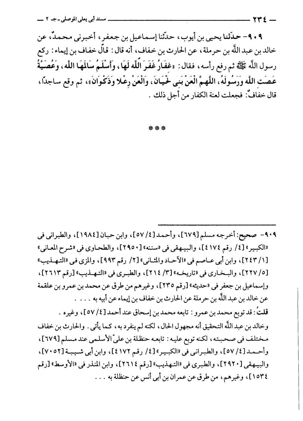 ٩٠٩ - حدّثنا يحيى بن أيوب، حدّثنا إسماعيل بن جعفرٍ، أخبرنى محمدٌ، عن خالد بن عبد الله بن حرملة، عن الحارث بن خفافٍ، أنه قال: قال خفاف بن إيماء: ركع رسول الله - صلى الله عليه وسلم - ثم رفع رأسه، فقال: "غِفَارُ غَفَرَ الله لَهَا، وَأَسْلَمُ سَالمَهَا الله، وَعُصَيَّةُ عَصَتِ الله وَرَسُولَهُ، اللَّهمَّ الْعَنْ بَنِى لحْيَانَ، وَالْعَنْ رِعْلا وَذَكوَانَ"، ثم وقع ساجدًا، قال خفاف: فجعلت لعنة الكفار من أجل ذلك.