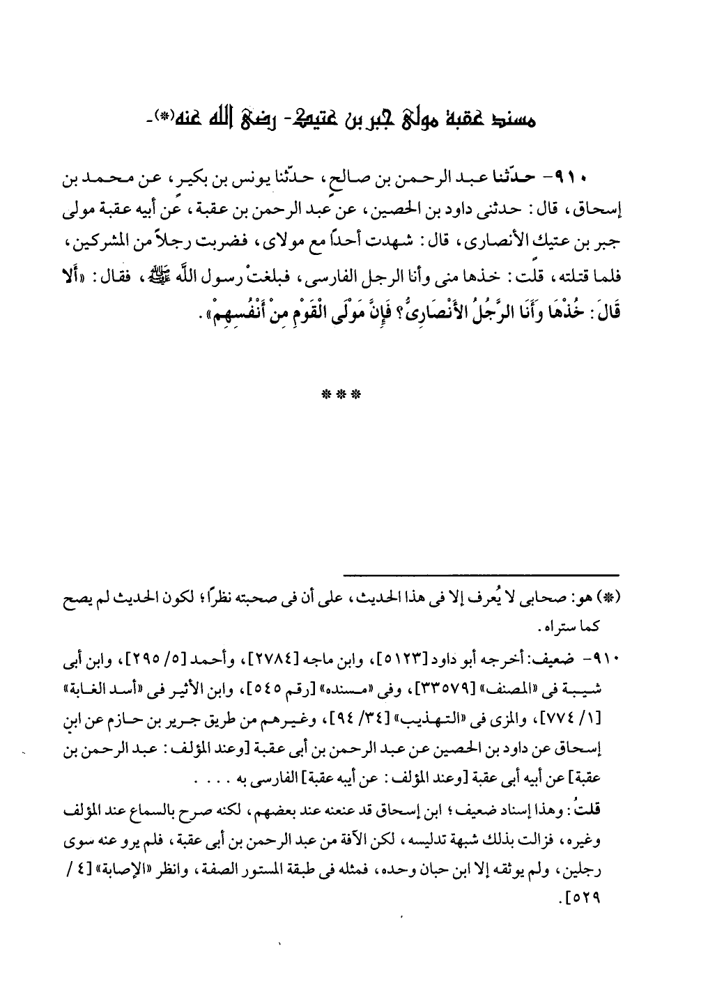 ٩١٠ - حدّثنا عبد الرحمن بن صالحٍ، حدّثنا يونس بن بكيرٍ، عن محمد بن إسحاق، قال: حدثنى داود بن الحصين، عن عبد الرحمن بن عقبة، عن أبيه عقبة مولى جبر بن عتيكٍ الأنصارى، قال: شهدت أحدًا مع مولاى، فضربت رجلًا من المشركين، فلما قتلته، قلت: خذها منى وأنا الرجل الفارسى، فبلغتْ رسول الله - صلى الله عليه وسلم -، فقال: "أَلا قَالَ: خُذْهَا وَأَنَا الرَّجُل الأَنْصَارِيُّ؟ فَإِنَّ مَوْلَى الْقَوْمِ مِنْ أَنْفسِهِمْ".