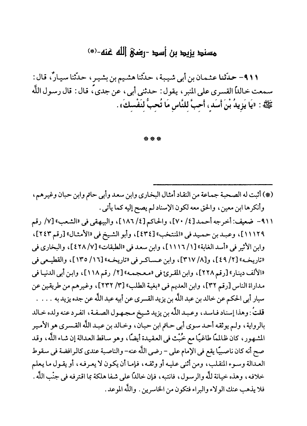 ٩١١ - حدّثنا عثمان بن أبى شيبة، حدّثنا هشيم بن بشير، حدّثنا سيارٌ، قال: سمعت خالدًا القسرى على المنبر، يقول: حدثنى أبى، عن جدى، قال: قال رسول الله - صلى الله عليه وسلم -: "يَا يَزِيدُ بْنَ أَسَدٍ، أَحِبَّ لِلنَّاسِ مَا تُحِبُّ لِنَفْسِكَ".