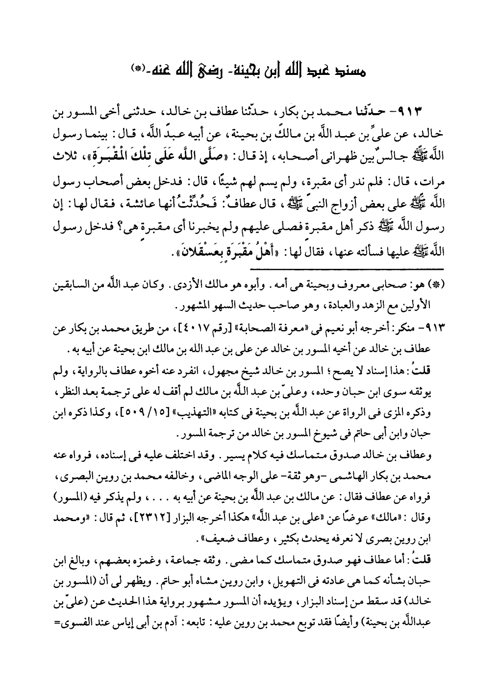 ٩١٣ - حدّثنا محمد بن بكارٍ، حدّثنا عطاف بن خالدٍ، حدثنى أخى المسور بن خالد، عن عليِّ بن عبد الله بن مالك بن بحينة، عن أبيه عبد الله، قال: بينما رسول الله - صلى الله عليه وسلم - جالسٌ بين ظهرانى أصحابه، إذ قال: "صَلَّى الله عَلَى تِلْكَ الْمقْبَرَةِ"، ثلاث مرات، قال: فلم ندر أي مقبرةٍ، ولم يسم لهم شيئًا، قال: فدخل بعض أصحاب رسول الله - صلى الله عليه وسلم - على بعض أزواج النبي - صلى الله عليه وسلم -، قال عطافٌ: فَحُدِّثْتُ أنها عائشة، فقال لها: إن رسول الله - صلى الله عليه وسلم - ذكر أهل مقبرةٍ فصلى عليهم ولم يخبرنا أي مقبرةٍ هي؟ فدخل رسول الله - صلى الله عليه وسلم - عليها فسألته عنها، فقال لها: "أَهْلُ مَقْبَرَةٍ بِعَسْقَلانَ".