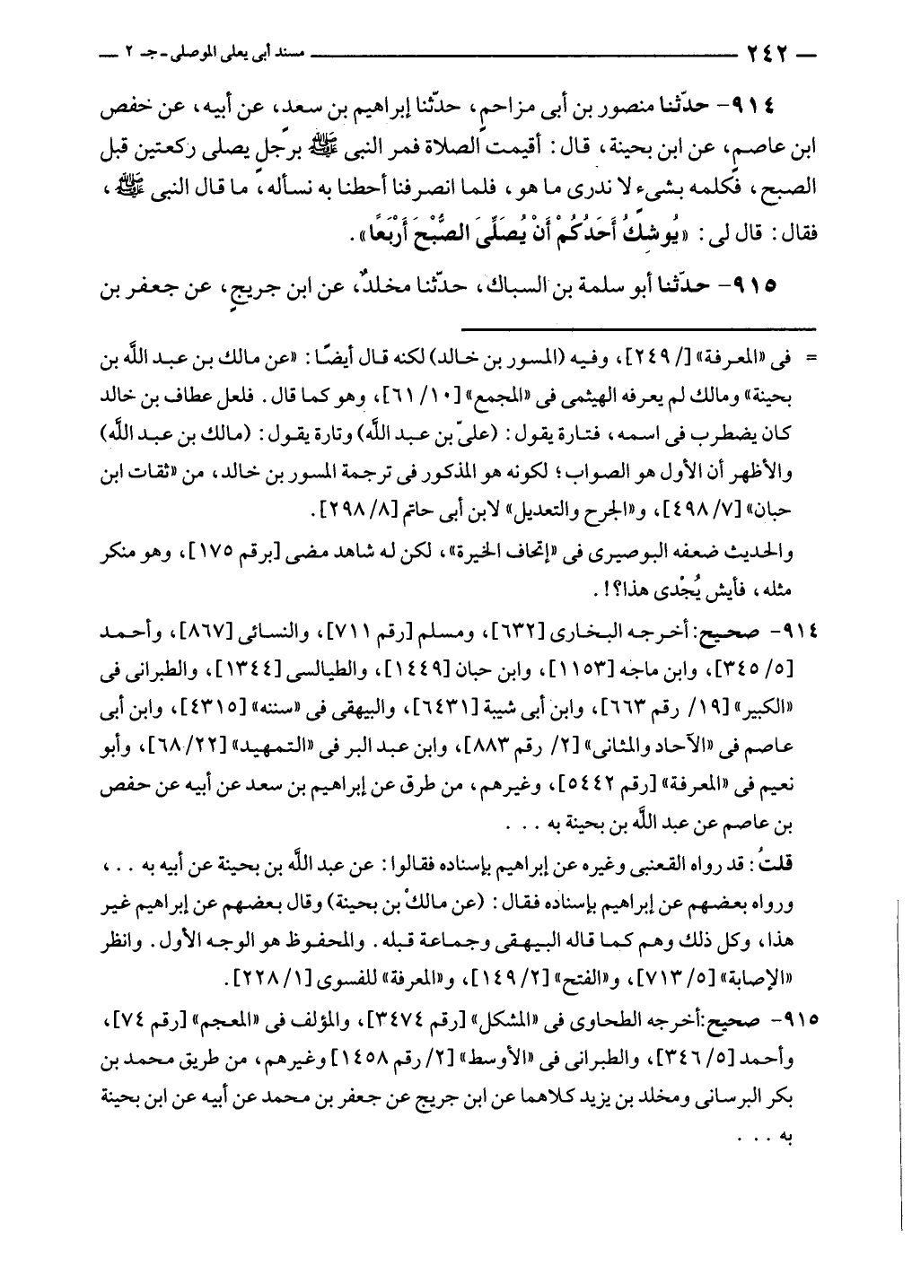 ٩١٤ - صحيح: أخرجه البخارى [٦٣٢]، ومسلم [رقم ٧١١]، والنسائى [٨٦٧]، وأحمد [٥/ ٣٤٥]، وابن ماجه [١١٥٣]، وابن حبان [١٤٤٩]، والطيالسى [١٣٤٤]، والطبرانى في "الكبير" [١٩/رقم ٦٦٣]، وابن أبى شيبة [٦٤٣١]، والبيهقى في "سننه" [٤٣١٥]، وابن أبى عاصم في "الآحاد والمثانى" [٢/ رقم ٨٨٣]، وابن عبد البر في "التمهيد" [٢٢/ ٦٨]، وأبو نعيم في "المعرفة" [رقم ٥٤٤٢]، وغيرهم، من طرق عن إبراهيم بن سعد عن أبيه عن حفص بن عاصم عن عبد الله بن بحينة به ...